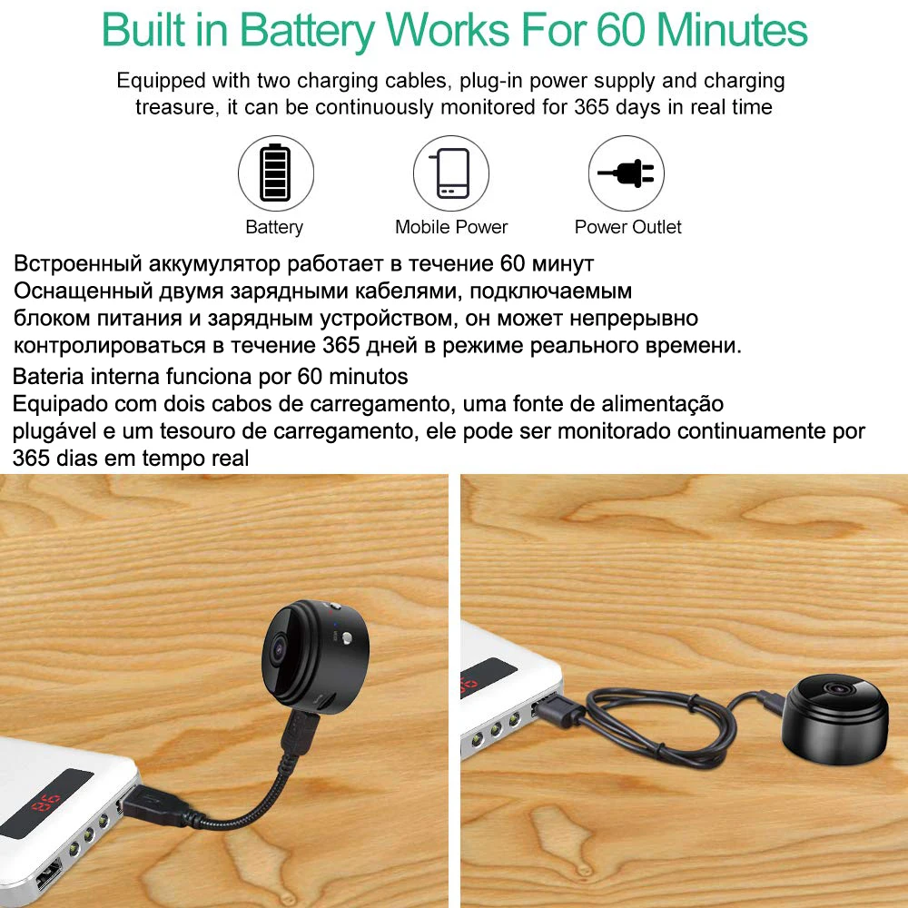 «ДЛИТЕЛЬНАЯ РАБОТА АККУМУЛЯТОРА»: Эта камера поставляется с высококачественной перезаряжаемой литий-ионной батареей 300 мА/ч, которая может поддерживать непрерывную HD видеозапись около 1 часа. Кроме того, вы можете заряжать эту беспроводную камеру Wi-Fi включенными в комплект зарядными кабелями, чтобы продолжать запись, также камера поддерживает цикличную запись, и запись и воспроизведение с помощью micro SD карты (до 128 Гб, не входит в комплект). Таким образом, ее также можно использовать в конференц-зале, автомобиле, путешествии, магазине, при езде на велосипеде, в спортзале.