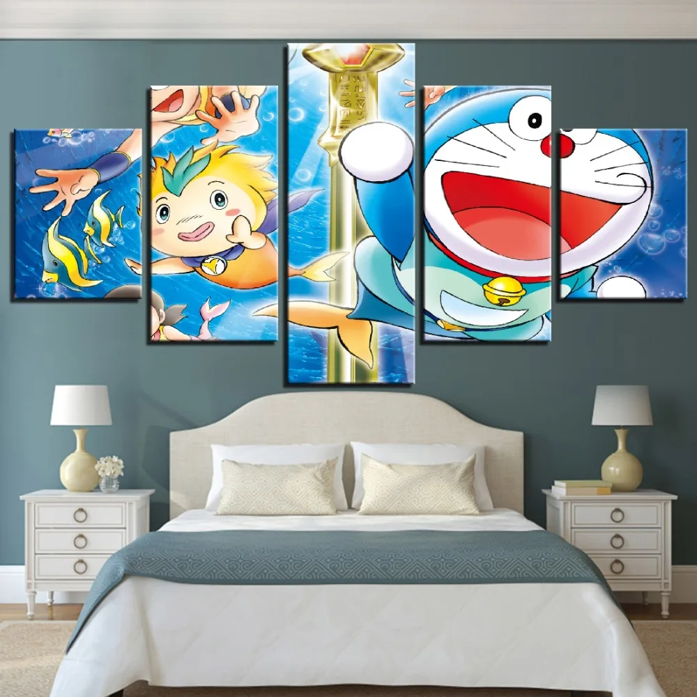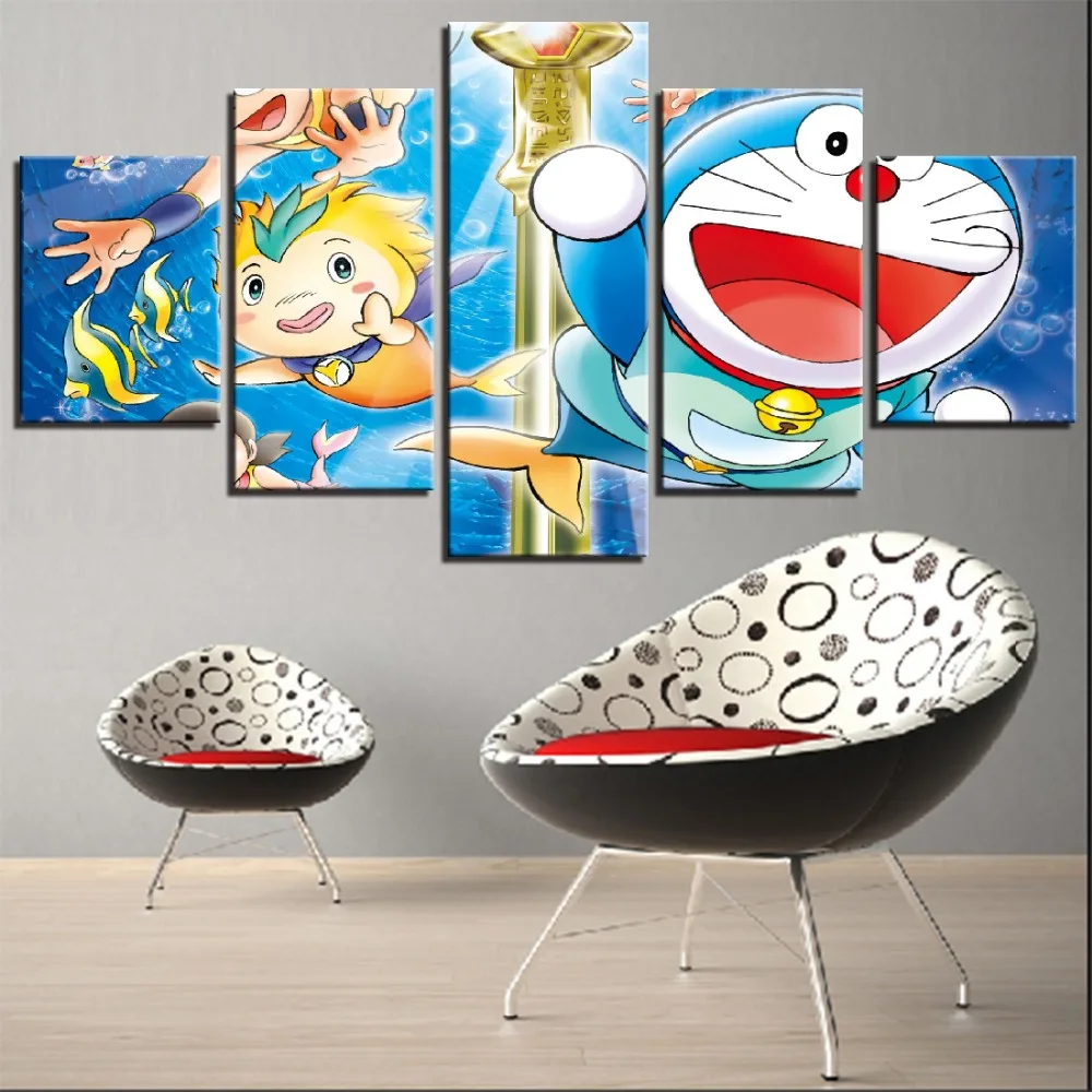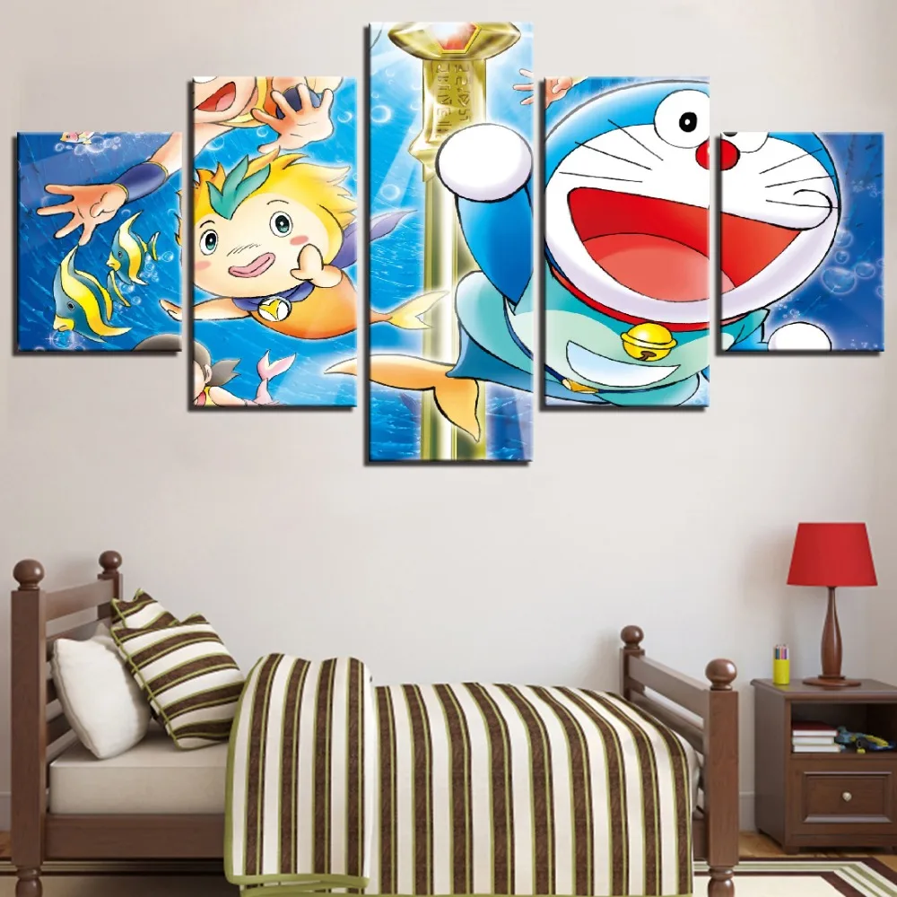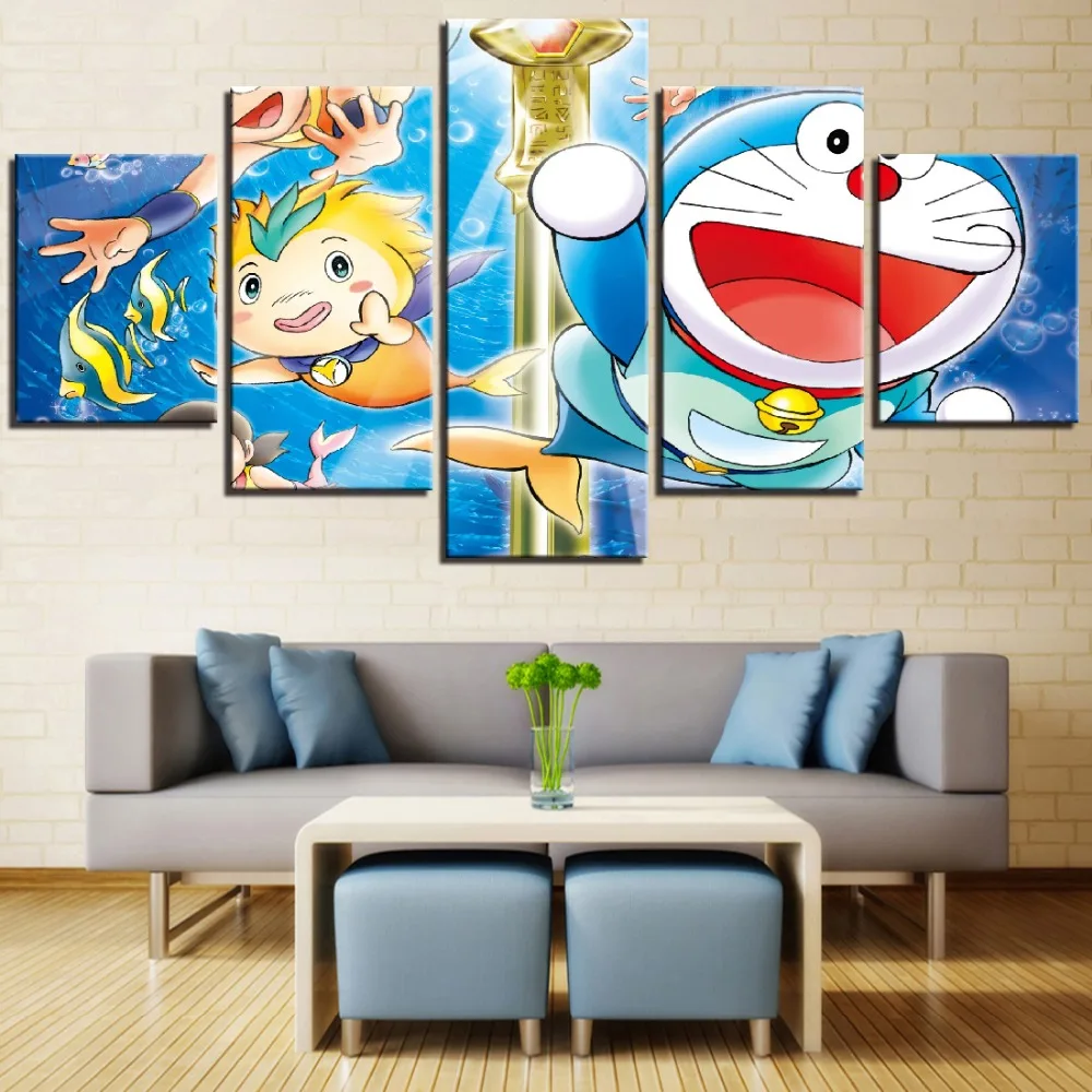 Картина на холсте, настенная живопись, 5 шт., аниме Дораэмон и русалка, машина, постер, постер с принтом, домашний декор для комнаты, рамки