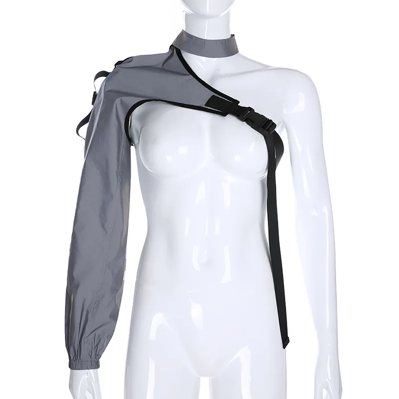 Крутые Женские Светоотражающие Лоскутные ленты пуловер для женщин на одно плечо с длинным рукавом чокер кроп Топы Ультра короткие хип хоп толстовки