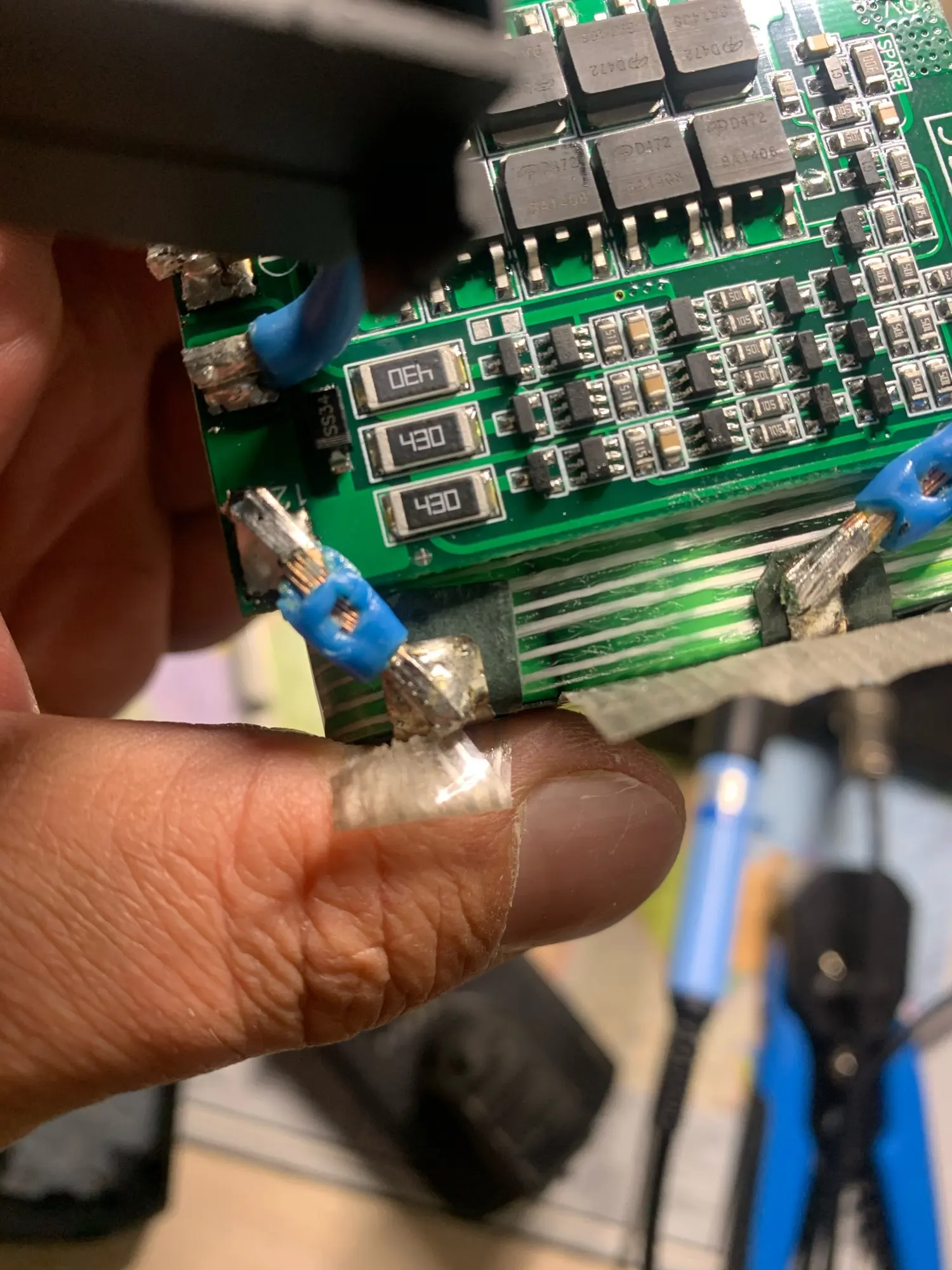 Долгая доставка , но в итоге шуруповёрт на 18 вольт работает прекрасно! И при резком нажатии на курок и при торможении в защиту не уходит .Подключил по прилагаемой схеме на 5 батарей.Подключал и проверял со свободными крайними красным и черным проводом на разъёме.Работает.Подключал эти провода на В+ и В- батареи , так же работает. На плате два MOSFET KNB3306B. Пусть спецы определяют плохо это или хорошо .