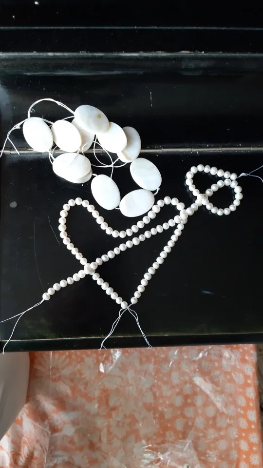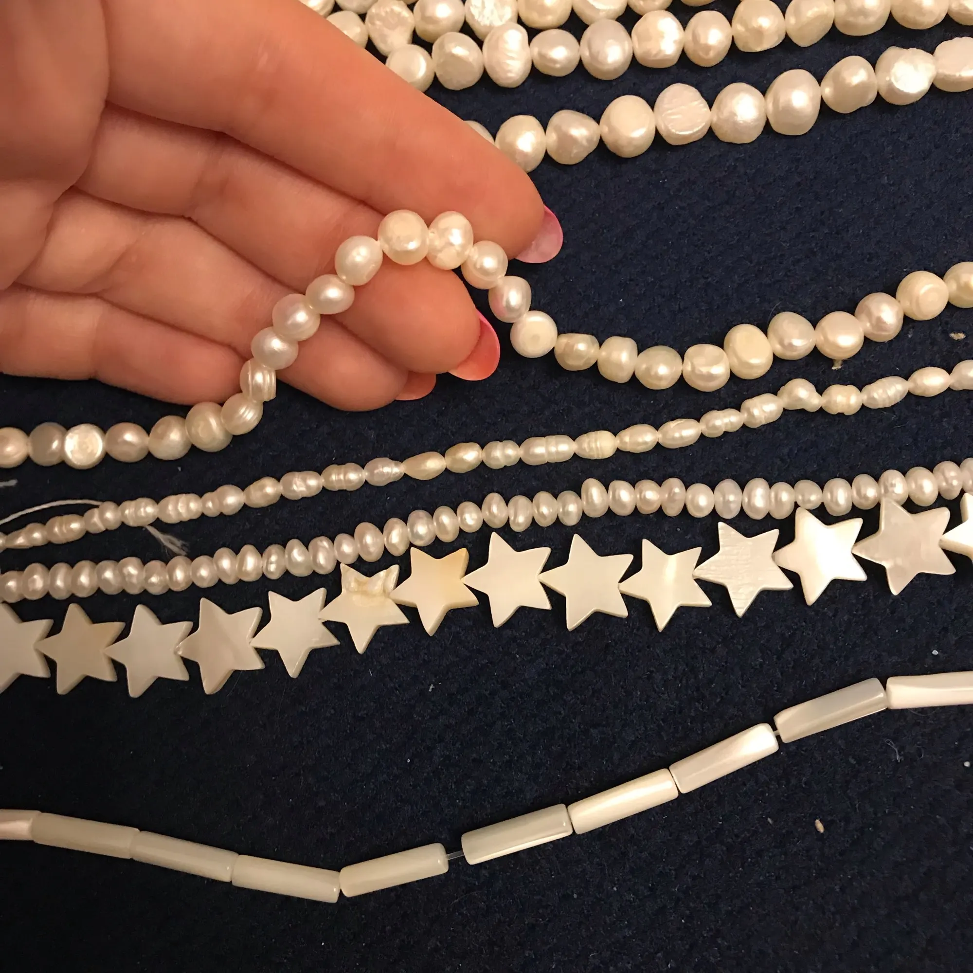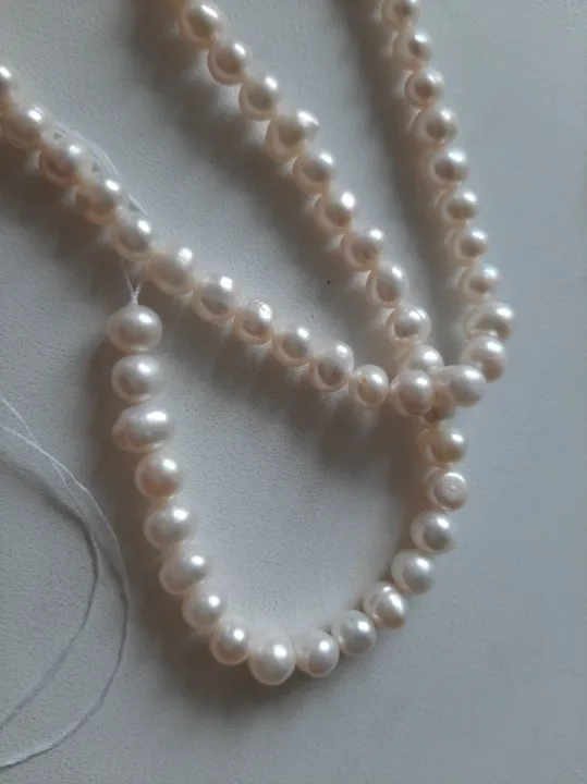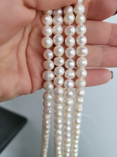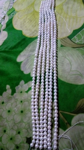 Бусины не белого цвета, как на фото. а скорее чуть желтоватые. Заказанным параметрам соответствует на одной нити 7штук, на второй-11 штук, на третьей нити не стала даже считать. Размер бусин и форма совершенно разная: от вытянутых до совершенно круглых. Размер не превышает, в основном 6мм... Так, что более 3-х звезд поставить не могу...