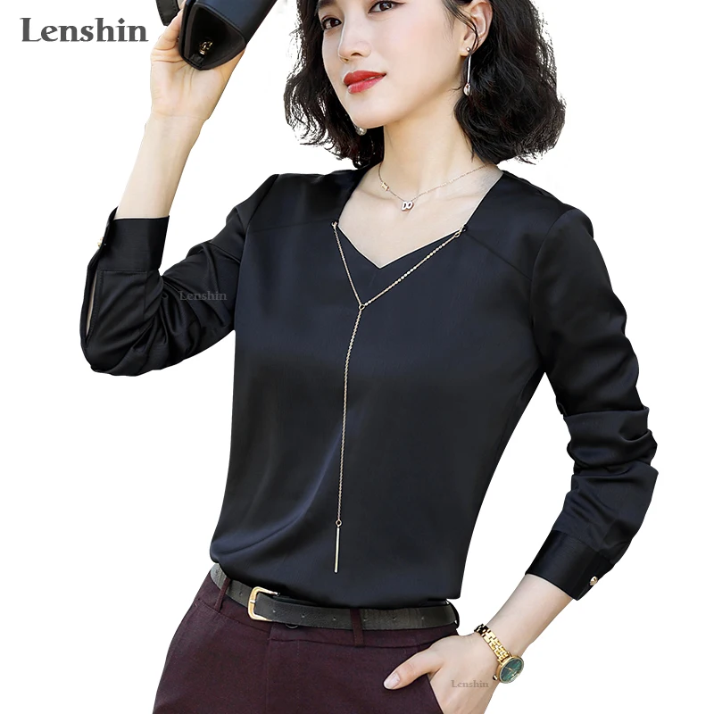 Lenshin, рубашки с v-образным вырезом для женщин, высокое качество, блузка с цепочкой, рабочая одежда, офисные женские топы, сорочка, свободный стиль