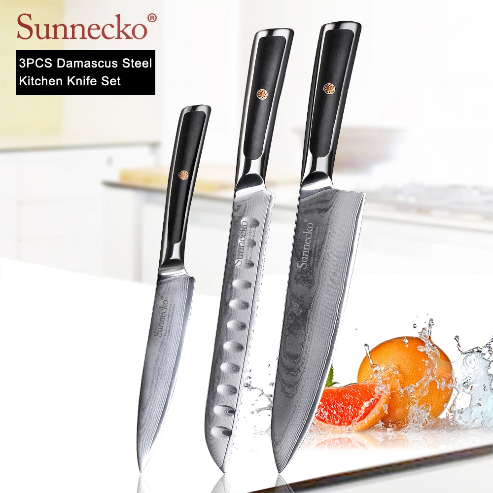 SUNNECKO новый набор кухонных ножей из 3 предметов, нож шеф-повара для хлеба, японский нож VG10 Core, лезвие из дамасской стали, G10, кухонный нож с ручкой
