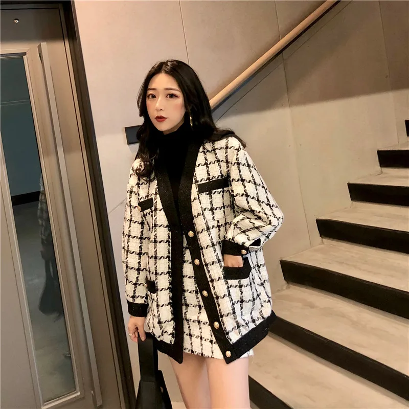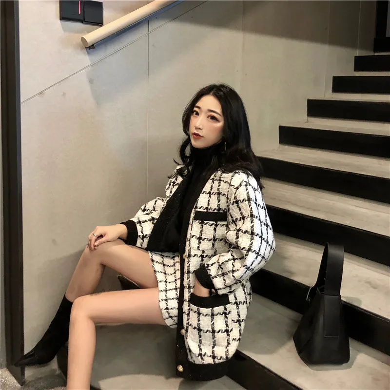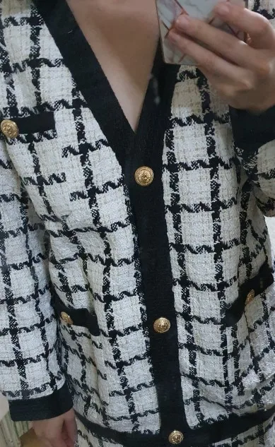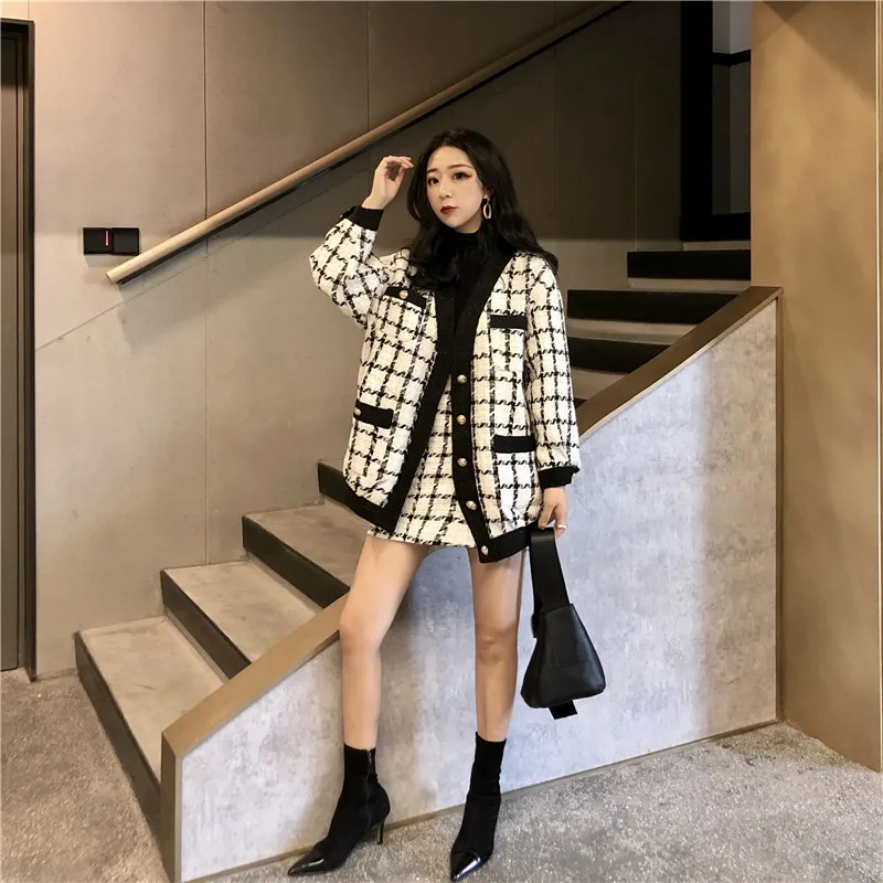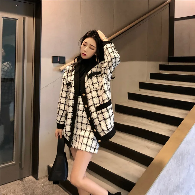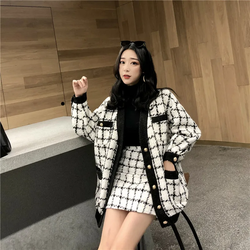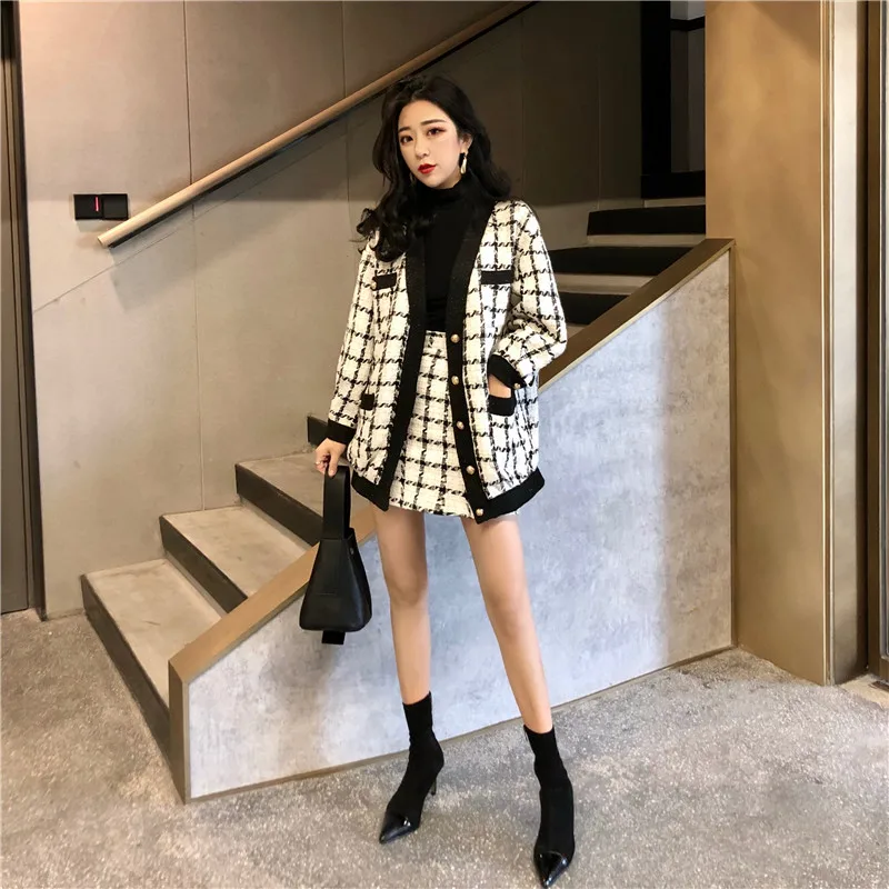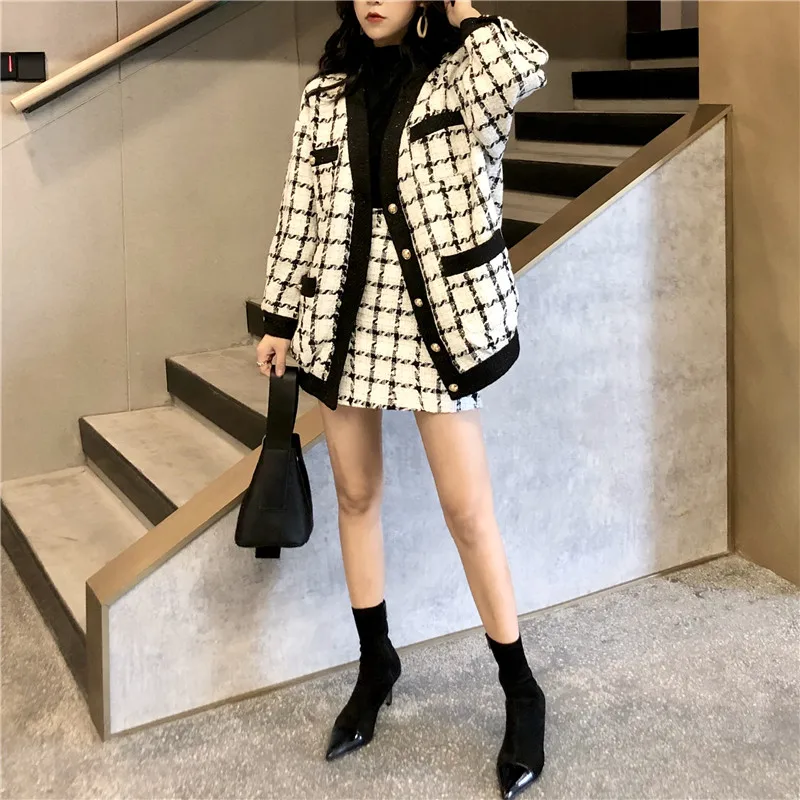 Женский твидовый шерстяной костюм, пиджак с длинным рукавом и мини-юбка, винтажный комплект из 2 предметов, Осень-зима 2021