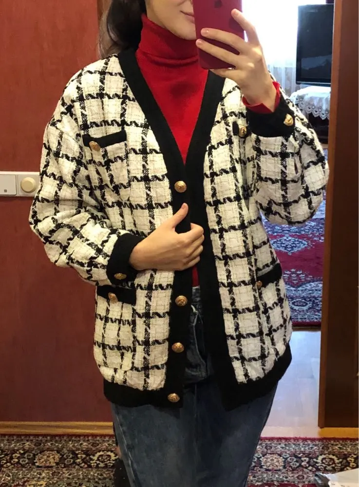 Плохое качество материала: полиэстер. Много просторных ниток, торчащих везде. Кардиган не имеет формы, рукава короткие. Это позволяет вам выглядеть как картофель. Не стоит того.