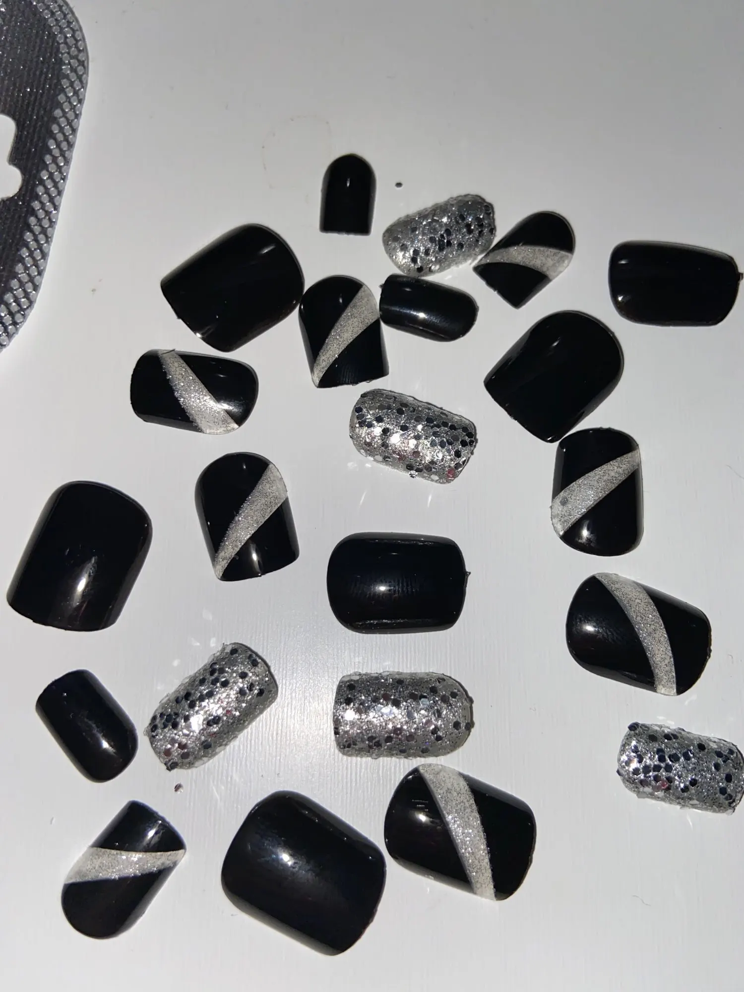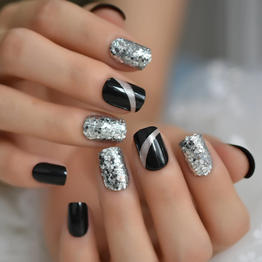 Грубые серебряные блестящая искусственная ногтей, короткие черные ногти, искусственные акриловые накладные ногти для женщин, для пальцев