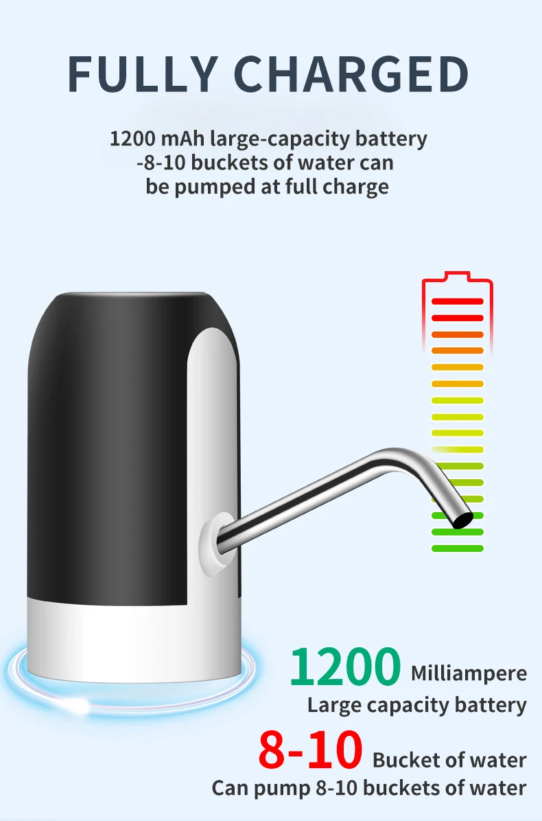 Перезаряжаемая батарея USB: Встроенная перезаряжаемая батарея емкостью 1200 мАч. Может использоваться в течение 30-40 дней или около 4-6 бутылок 5 галлонной воды после полной зарядки. Не нужно заряжать каждый день.