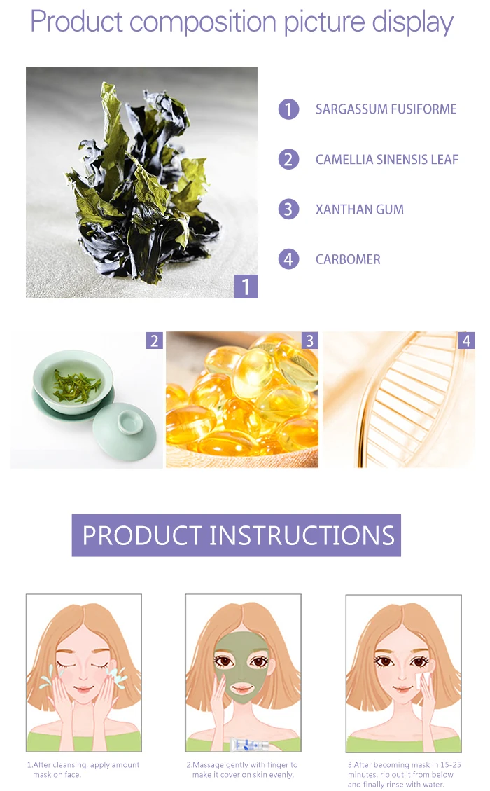 1. После очищения нанесите маску на лицо. (Обратите внимание, чтобы избежать глаз и губ.)2. Мягко помассируйте пальцем, чтобы он равномерно покрыл кожу.3. После того, как маска в течение 15-25 минут, извлеките ее снизу и, наконец, промойте водой.