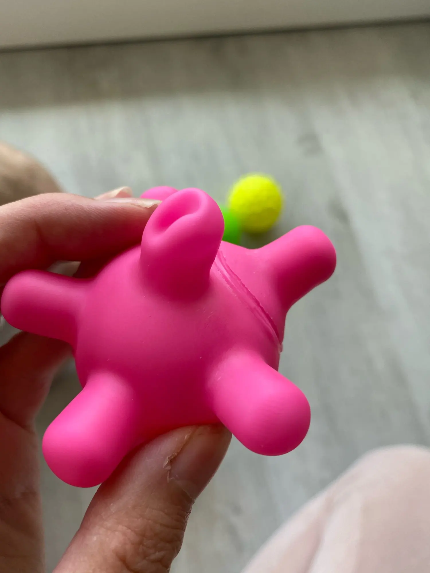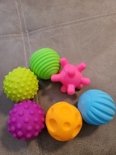Игрушки классные . Очень полезны для развития сенсорики. Запах был как у всех резиновых игрушек. Выветрился быстро. Доставили в срок.