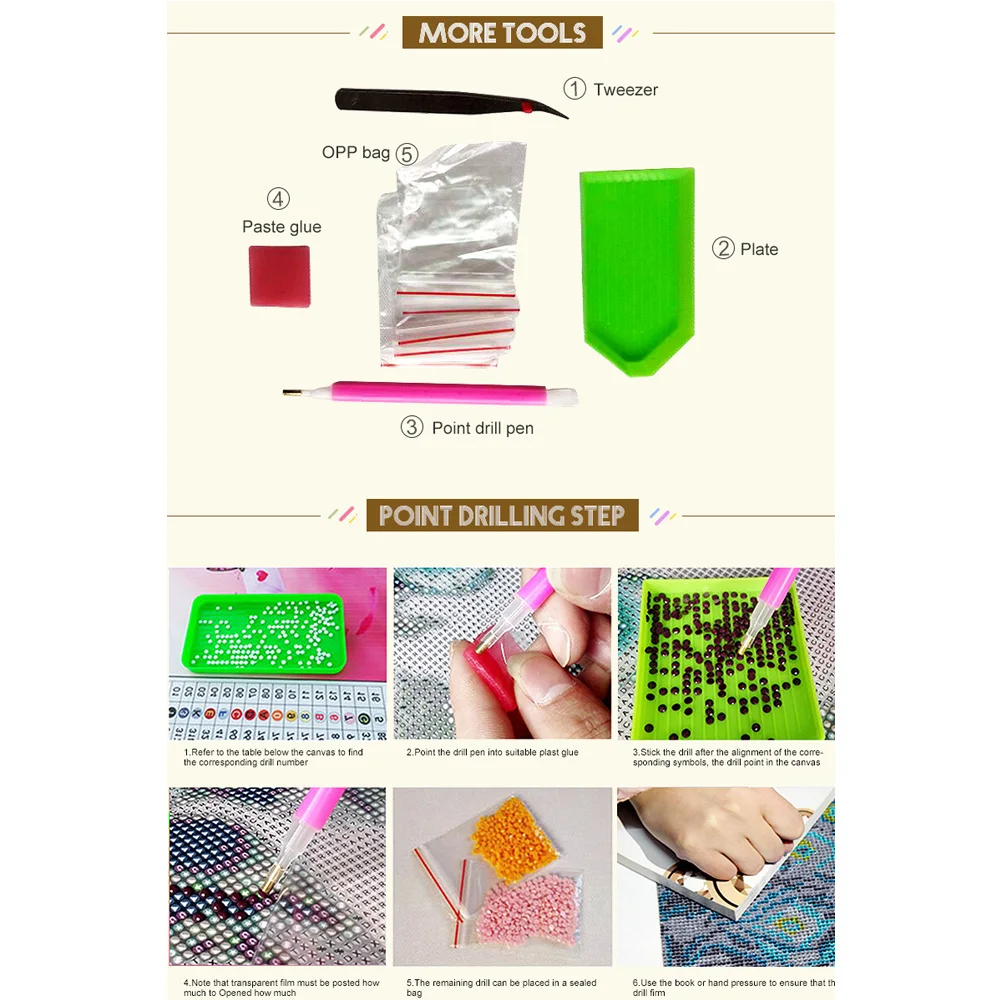 Посылка включает в себя: Полное сверло, ткань с принтом, инструменты.