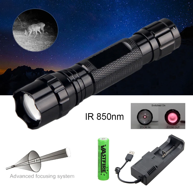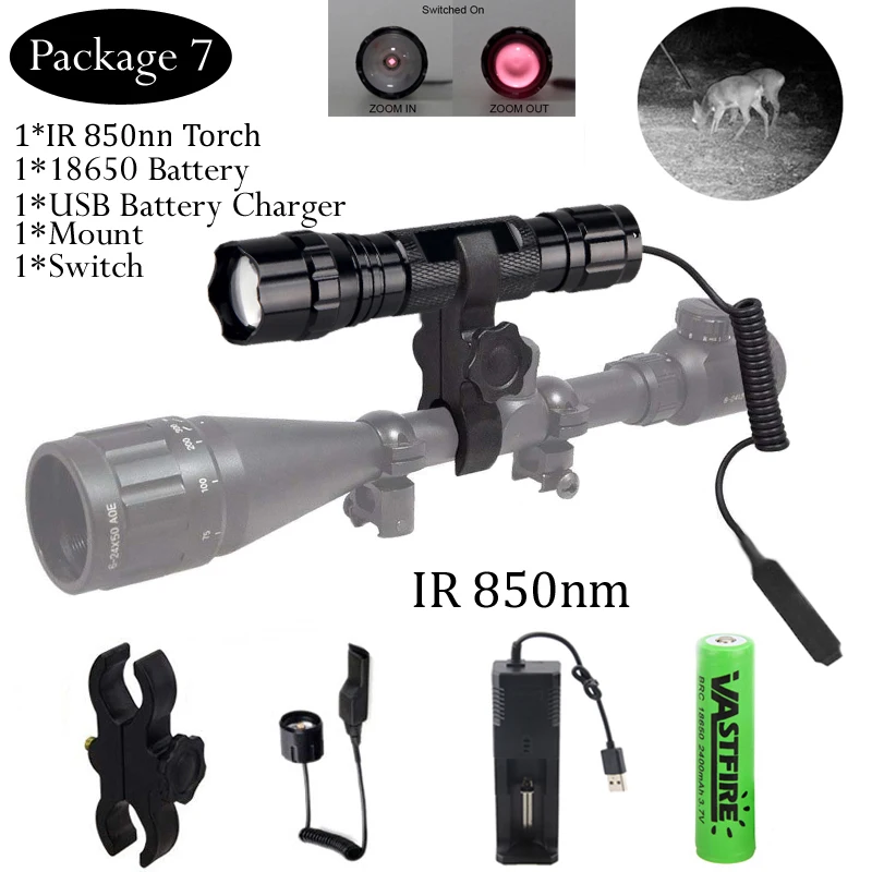 Muy potente. La variación del enfoque permite iluminar a diferentes distancias con facilidad. Incluye batería 3,7V y su cargador conectable a cualquier cable mini USB de celular, además de accesorios para montar sobre una mira telescópica normal y el cable de interruptor volante para controlar su encendido. Lo único malo es que para mantener encendida la linterna se debe mantener presionado el interruptor volante. La prueba con cámara IR fue exitosa! en plena oscuridad parece que la luz normal de casa estuviese encendida.