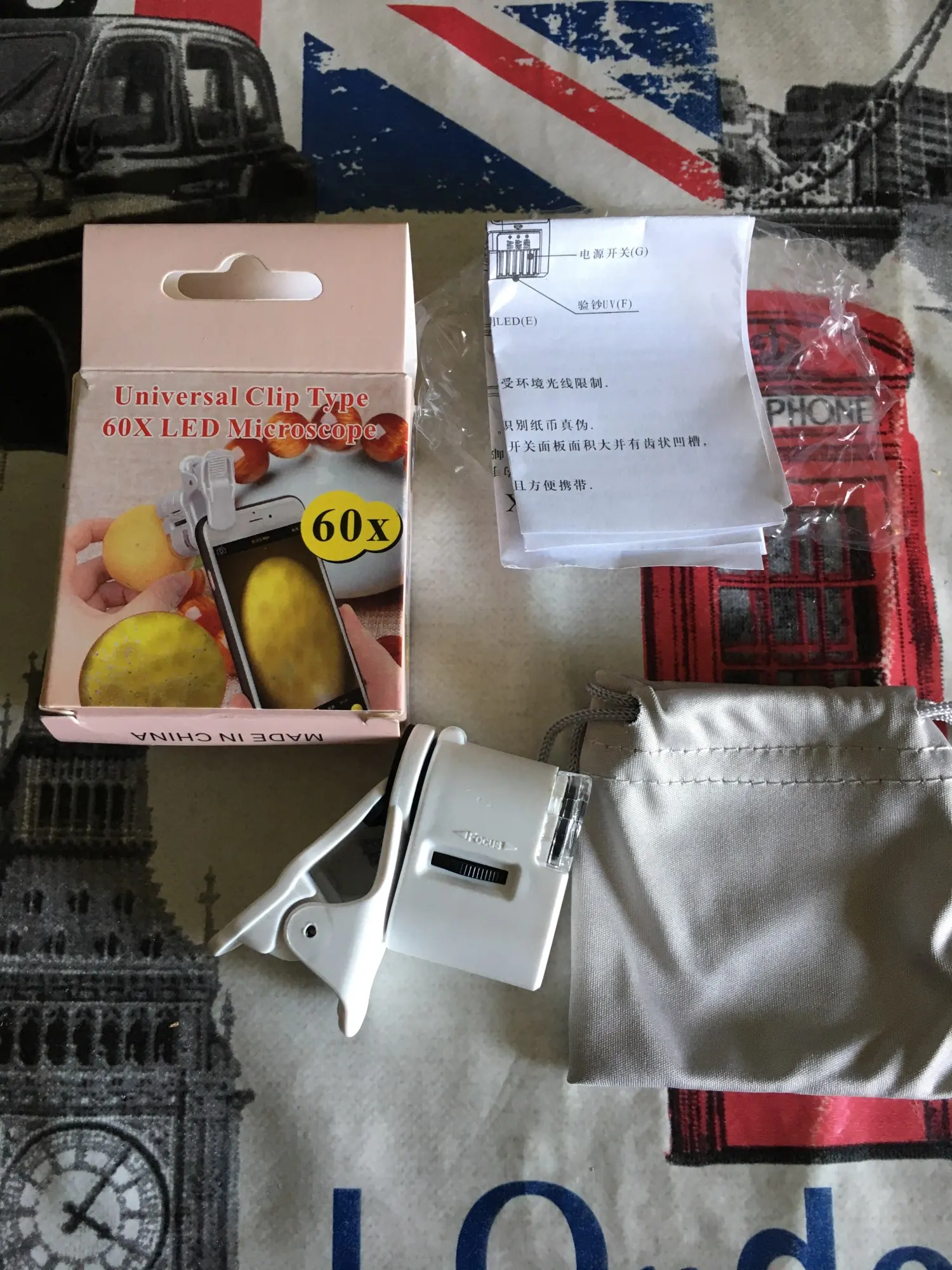 Этот микроскоп с зажимом действительно потрясающий. Нормальный микроскоп тяжелый и трудно использовать, когда вы находитесь на улице, но это простое и легкое решение. Качество отличное. Поместите его на камеру телефона, используйте свет и Увеличьте его. Я использую его для многих вещей в последние дни для развлечения, таких как насекомые, одежда, ювелирные изделия или другие вещи. Действительно большое спасибо продавцу! Продукт пришел быстро, и он действительно работает.