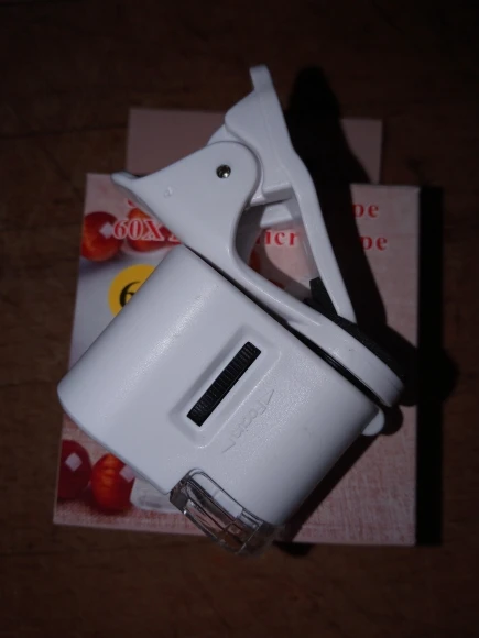 Брал для контроля РК ножа при заточке. На телефон сел плохо (Xiaomi Mi9T), поэтому клипсу пришлось открутить. Смотрю прямо так. Качество картинки отличное, только плохо что окуляр маленький. Подсветка простая и голубая. Голубая не знаю для чего нужна, с ней не видно ничего. а вот белая которая - отлично. Пришел с батарейками, так что сразу в работу. Кому нужен - рекомендую.