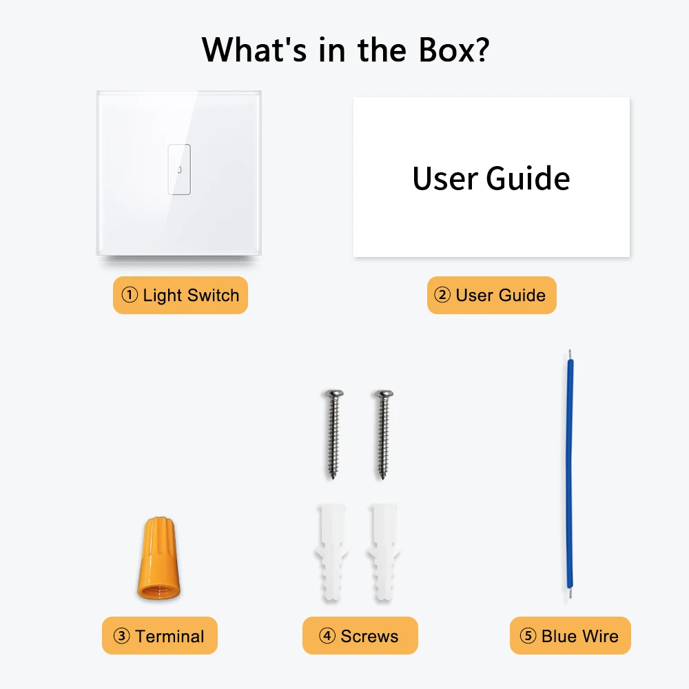 1) 1 переключатель 2) 1 Руководство пользователя 3) 2 винта 4) 1 синий провод для легкой установки 5) 1 терминал в подарок
