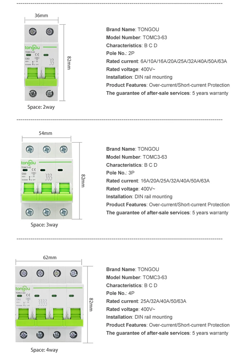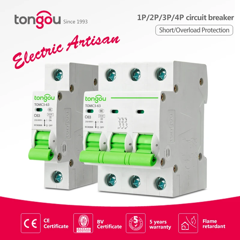 Мини-автоматический выключатель AC, 1P 2P 3P 4P 6A 10A 16A 20A 25A 32A 40A 50 63A Curve C MCB 110V 220V 4.5KA AC TOMC3-63