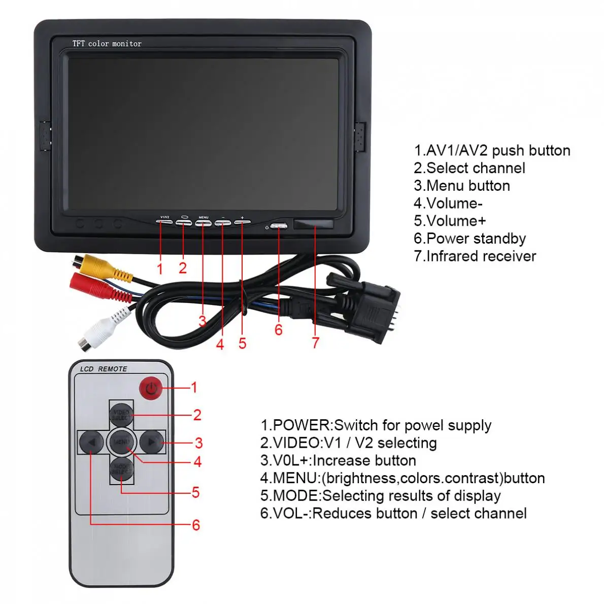 Особенности:-7-дюймовый домашний монитор VGA, широкий угол обзора 170 градусов, функция переворота изображения вверх и вниз, регулируемый угол, вы можете настроить видеоэкран в соответствии с собственным, полноразмерное визуальное наслаждение высокой четкости-Отмените автоматическое визуальное изображение, соответствующее изображению AV2. Вы можете нажать на панель AV1/AV2, чтобы отобразить видимое изображение в режиме ожидания, а также автоматически настроить рабочее состояние AV2.-Всю работу с пультом дистанционного управления кинетической энергией можно выполнять в соответствии с различными функциями, которыми может управлять поезд-Видеосистема заднего хода показывает, что монитор используется для многоцелевых дисплеев, особенно для использования с камерами. Четкая система обратного изображения-Интерфейс VGA + DC для различных вариантов, дополнительный интерфейс VGA/DC-Интерфейс VGA может быть подключен к компьютеру, компьютерному дисплею, интерфейсу передачи высокой четкости.-AV-интерфейс можно использовать в качестве бортового монитора для реверсивного изображения.