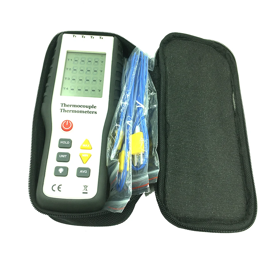 Очень хорошее устройство, хорошо упакованное, очень хорошее качество, измерения 4 одинаковых зонда, 1/10 градусов отклонения. Экран с подсветкой. По цене, честно говоря, это очень, очень хорошо. Нет футляра или пальца перчатки на зондах, что может сделать их более «хрупкими», но поэтому они более отзывчивы с точки зрения скорости отображения. Возможность поставить Другие зонды при необходимости.