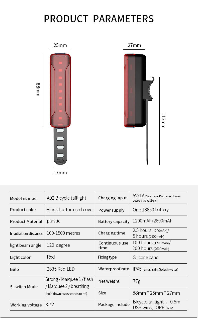 1.: Модель продукта: A02 задний светильник лампа2: Тип: Красный светодиодный светильник 28353: вход для зарядки: 5 В/1 А (Не используйте зарядное устройство 9 В, это может повредить устройство)4: Рабочее напряжение: 3,7 V/1A световой5: Цвет: красный светильник6: диапазон облучения: 240 градусов7: яркость освещения: 100 люменов8: длина волны лампы: 620нм9: угол луча: 120 градусов10: Емкость аккумулятора: 1200 мАч/2600 мАч11: Время зарядки: 2,5 часов (1200 мА · ч) / 5 часов (2600 мА · ч)12: Время разряда: 100 часов (1200 мАч) / 200 часов (2600 мАч)13: Напряжение зарядки: 5 В/1 А (Не используйте зарядное устройство 9 В, это может повредить устройство)14: режимы: Сильный-Marquee 1-Flash-Marquee 2-Breathing (Длительное нажатие в течение 2 секунд, чтобы выключить)15: характеристики продукта: 94 мм * 27 мм * 25 мм, Длина ремешка 110 ммПереключатель:1: Тип переключателя: push2: корпус переключателя3: Цвет: черный, красный чехол.4: Материал: поликарбонатный пластик5: Способ фиксации: силиконовый ремешок6: Водонепроницаемость: IPX5 (защита от дождя, брызг)
