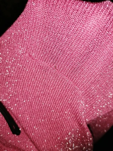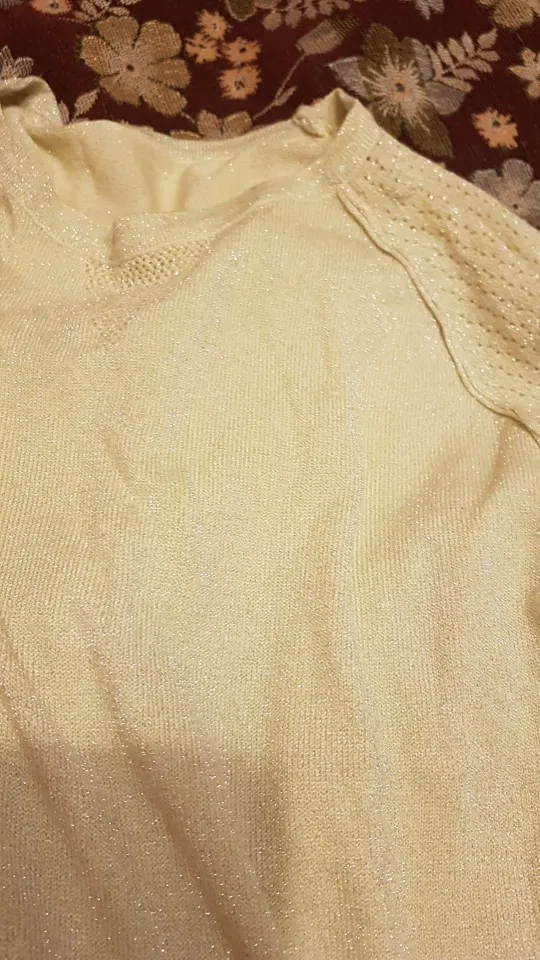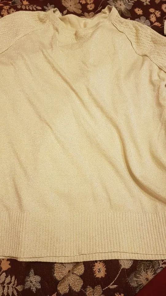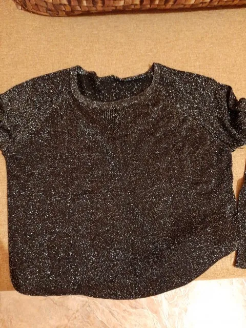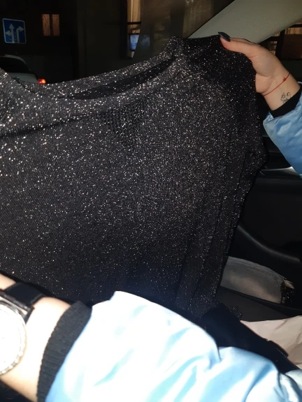 Тонкий еластичний пуловер. Люрексу набагато більше, ніж його видно на фото. Річ має ошатний вигляд. На 160 см , 40-й європейський розмір підійшов дуже добре. Отримала на 19-й день з моменту замовлення. Після прання вироб зберіг форму та колір.