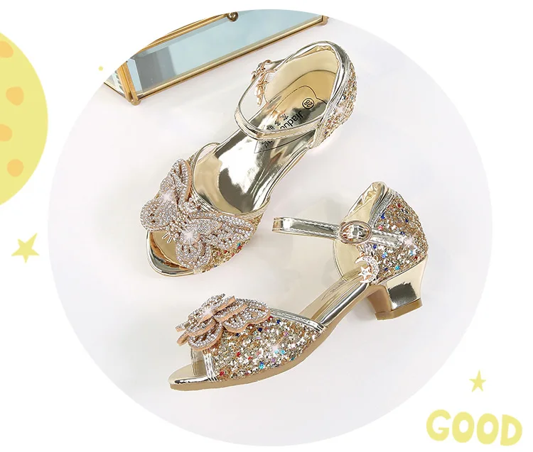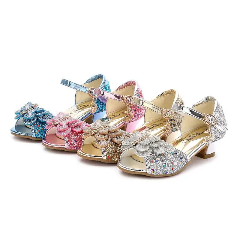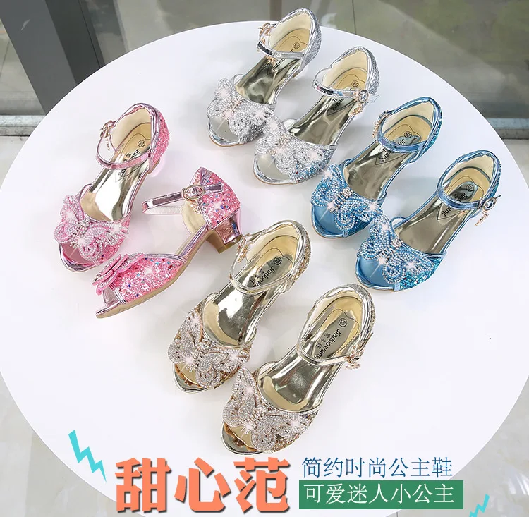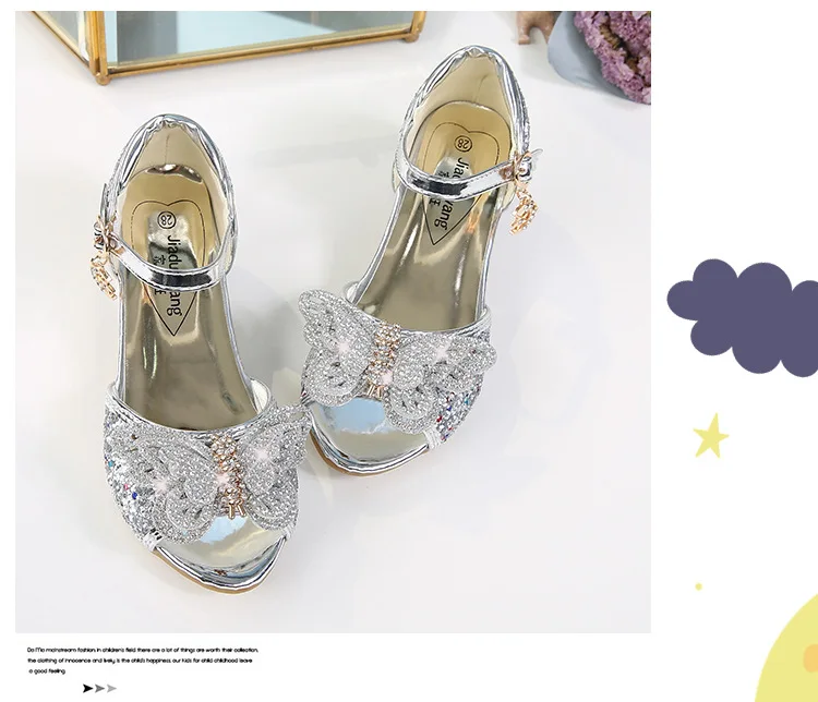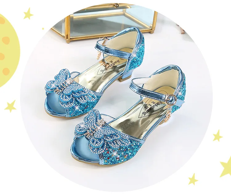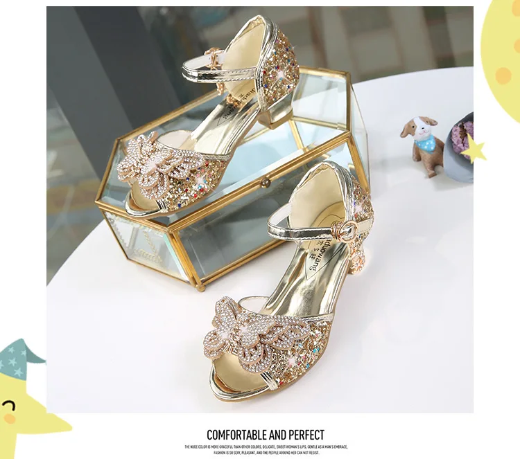 Детские сандалии для девочек, свадебные сандалии для девочек, обувь на высоком каблуке с кристаллами, банкетные кожаные туфли розового, золотого, синего цвета с блестками и бабочкой