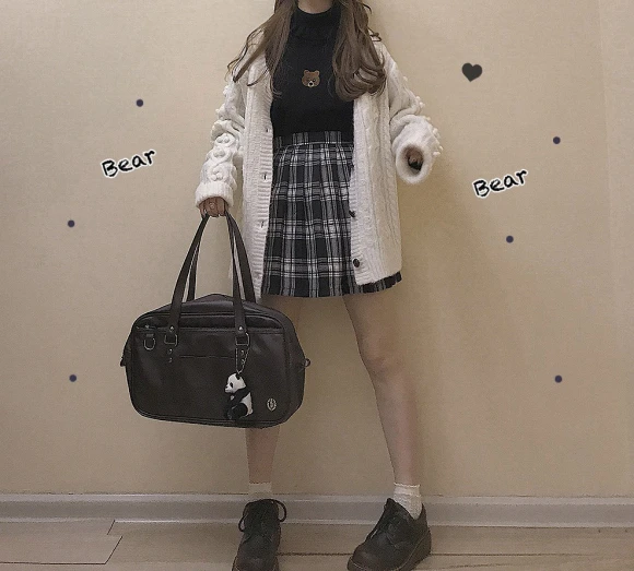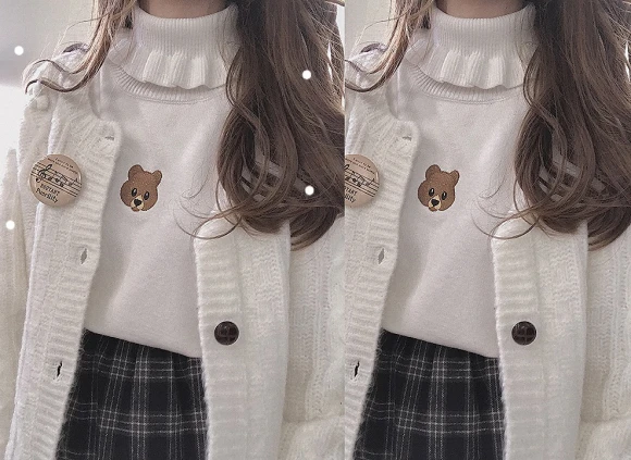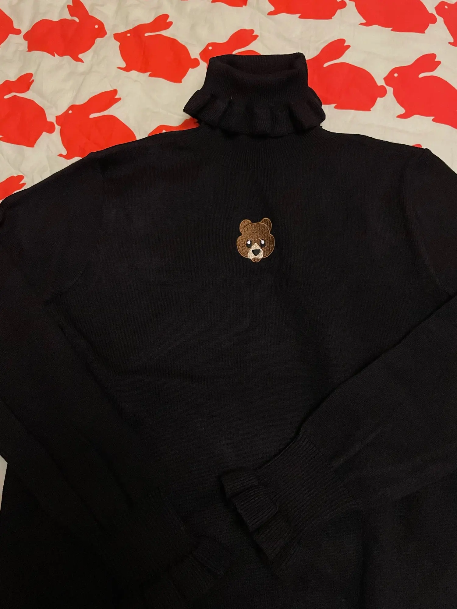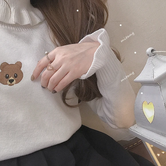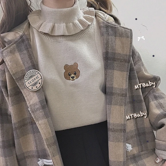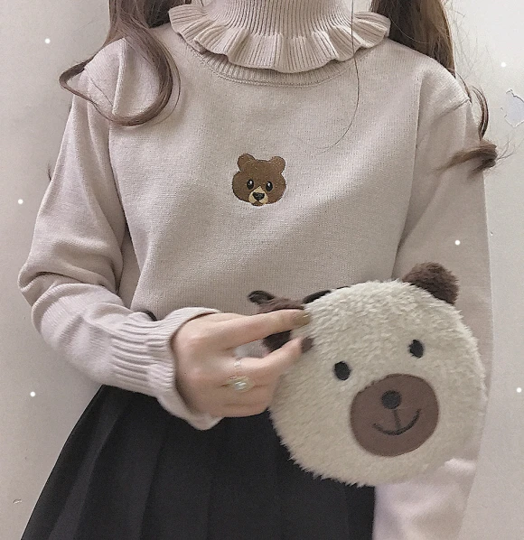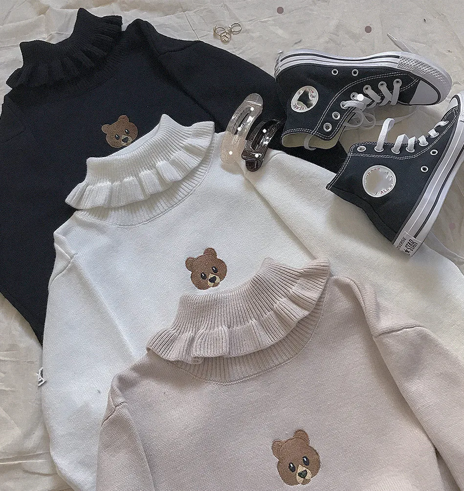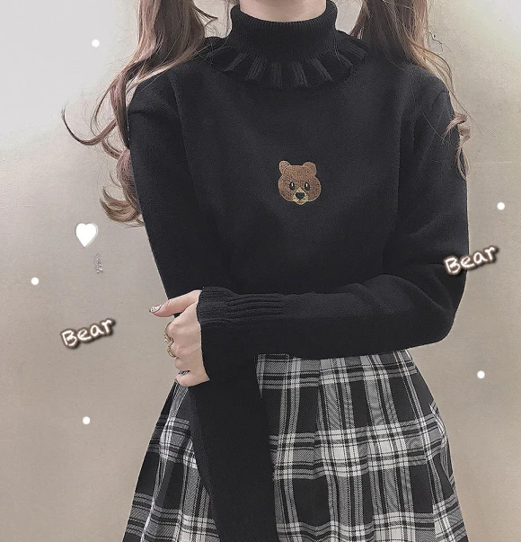 Свитер в стиле Харадзюку с милым медведем для девочек, винтажный трикотажный пуловер с высоким воротом, Женский облегающий джемпер с рюшами, белый, черный