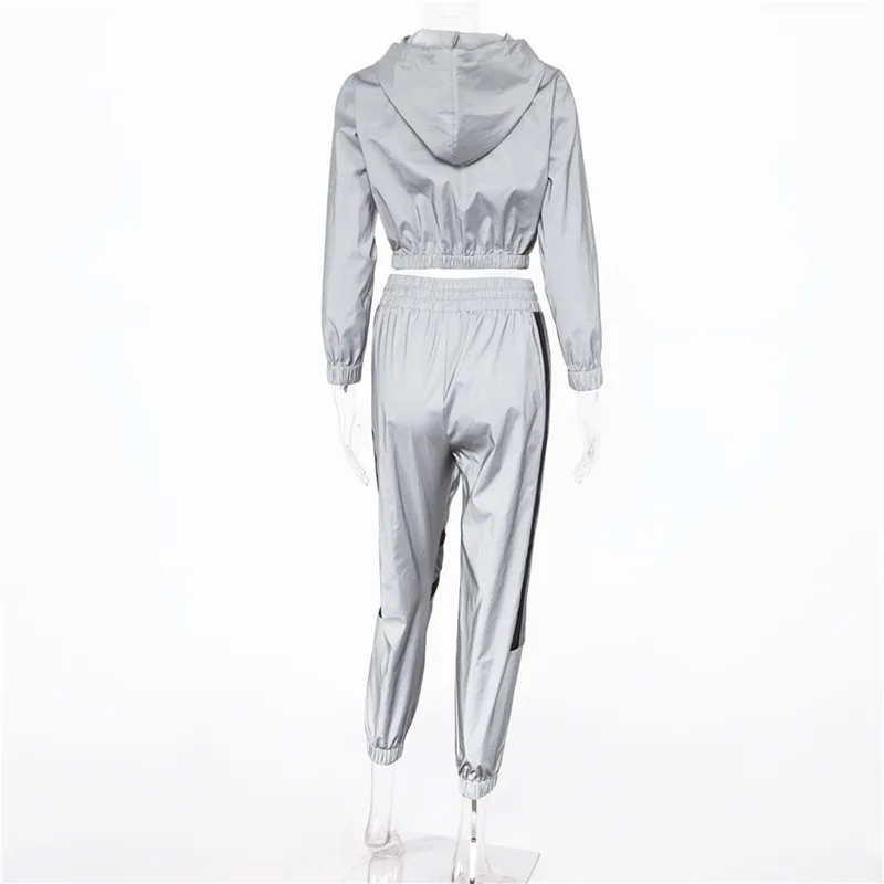 Женский светоотражающий костюм, повседневный спортивный костюм из двух предметов, укороченный жакет, спортивный костюм, 2019