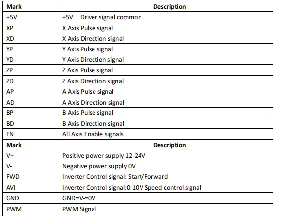 6. Интерфейс сигнала управления инвертором (изоляция оптопары): выход 0-10 в сигнал контроля скорости, сигнал управления скоростью ШИМ, сигнал управления пуском шпинделя, используется для программного обеспечения mach3 для контроля скорости вращения шпинделя, запуск и остановка;