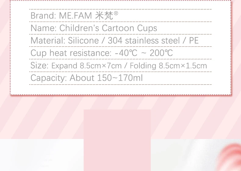 ME.FAM набор силиконовых складных чашек милые Мультяшные животные с крышкой открытый складной путешествия ребенок Чистка зубов полоскание CopaТехнические характеристикиБренд: ME.FAMНазвание: Детские Мультипликационные ЧашкиМатериал: Силикон/304 нержавеющая сталь/PEЦвет: розовый/синий/фиолетовый/мятныйТермостойкость:Термостойкость чашки: -40°C ~ 200°CТермостойкость крышки: -20°C ~ 50°CРазмер: Разложенный 8.5*7cm/Сложенный 8.5*1.5cmВместимость: Около 150~170mlСтиль: МультипликационныйОсобенности* Сопротивление высокой/низкой температуреТермостойкость чашки: -40°C ~ 200°CТермостойкость крышки: -20°C ~ 50°C* Экологически Чистые МатериалыМожет находиться в непосредственном контакте с водойИзготовлено из безопасного и прочного пищевого силиконаНетоксичный безвредный, безопасный и экологически чистый, пожалуйста, будьте уверены, что использование допускается.* Анти СлезаГибкость хорошая, мягкий силиконовый материал, не стареет, не деформируется, легко складывается, может длительно использоваться.* Легко чиститьГладкая поверхность. Хорошая гидрофобность, масло не проникает, не липкое, имеет небольшое количество моющего средства, легко моется, ополаскивается водой, легко чистится.* Небольшой объемРазложенный размер 8.5*7cm/Сложенный 8.5*1.5cmСкладная толщина всего 1.5cm, легко переносима.* 4 вида цветов (Розовый/синий/фиолетовый/Мятный) и 4 рисунка (обезьяна/Коала/Лев) можно выбрать, конфетный цвет-красочная жизнь, один ребенок, один цвет, одна чашка, легко различить.* Детская чашка, вместимость около 150~170ml, в соответствии с таблицей здоровой питьевой воды, планируйте, чтобы ваш ребенок пил воду каждый день.Применимая сценаОтель, Ресторан, Кафе, Бар, Кухня, Снаружи, Гостиная, Путешествия...Что такое силикон?ME.FAM Вся продукция изготовлена из экологически чистого силиконаСиликоновые происходит от камня на берегу моря!Основным компонентом силикагеля является кремний, природный компонент, присутствующий в песке, камне и хрустале. Обладает хорошей гибкостью, коррозионной устойчивостью и подходящей температурой. Подходит для приготовления пищи, выпекания и непосредственного контакта клинических материалов с пищевыми продуктами.Примечание: Ручное измерение размера, ошибка неизбежна, пожалуйста, преобладают в натуральном выражении! Из-за съемки расположение света и так разные, продукт будет производить различные степени хроматической аберрации, Пожалуйста, они преобладают в натуральном выражении; Все аксессуары снимают реквизиты для размещения, Сам продукт не содержит аксессуаров, Если о распространении будет уведомлено!Упаковочный лист:3 или 4 шт./лотМультфильм животных чашки(Покупайте несколько продуктов, если вам нужен смешанный цвет, пожалуйста, оставьте комментарий или оставьте нам сообщение нужного вам цвета. Если нет комментариев, считается что нужно отправить случайный цвет)