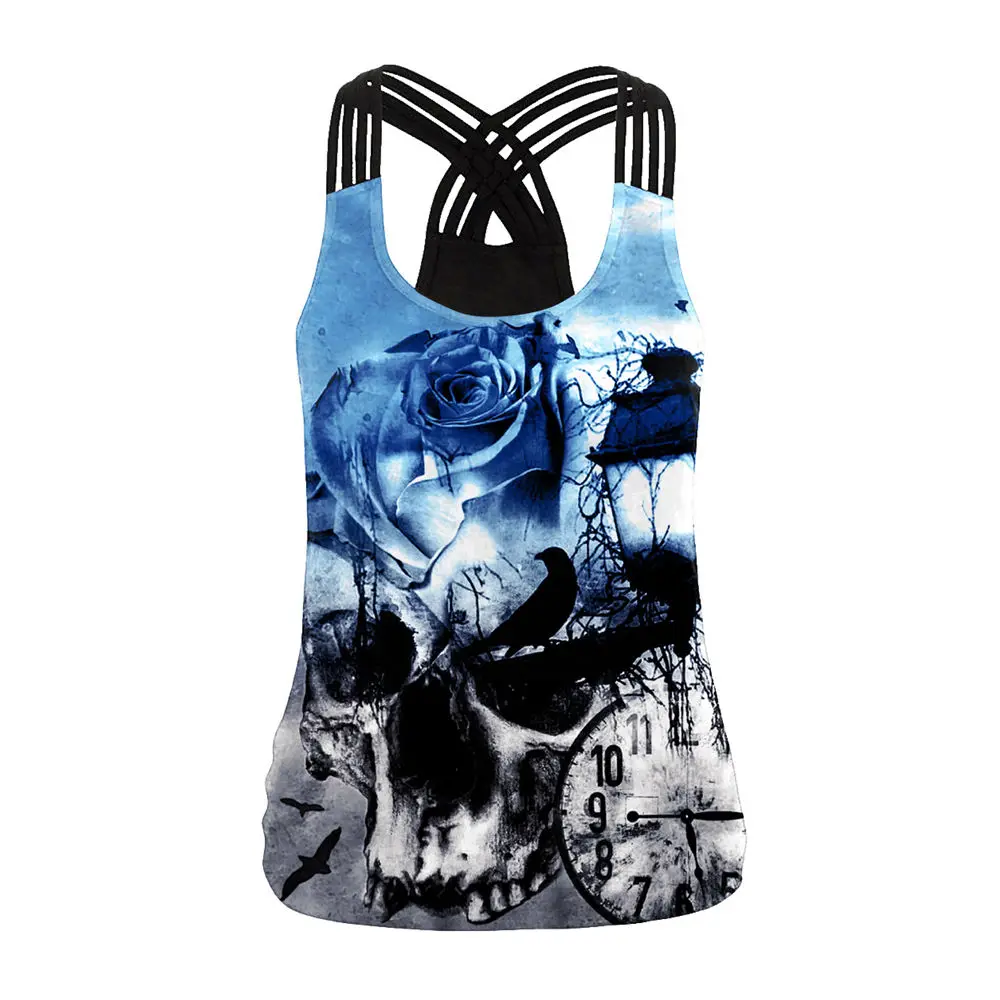 Женский спортивный жилет с 3D-принтом, летняя блузка с цветочным рисунком черепа, женская рубашка для йоги и бега, жилет, блузка с бретелькой через шею, облегающая блузка