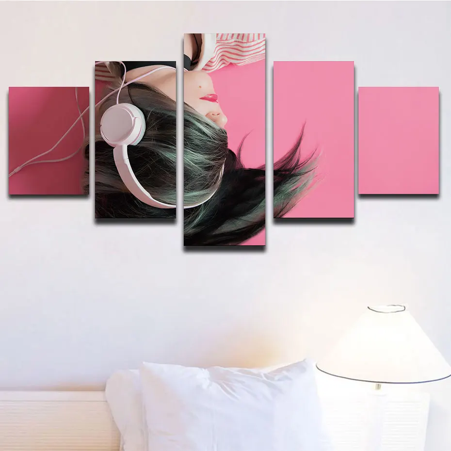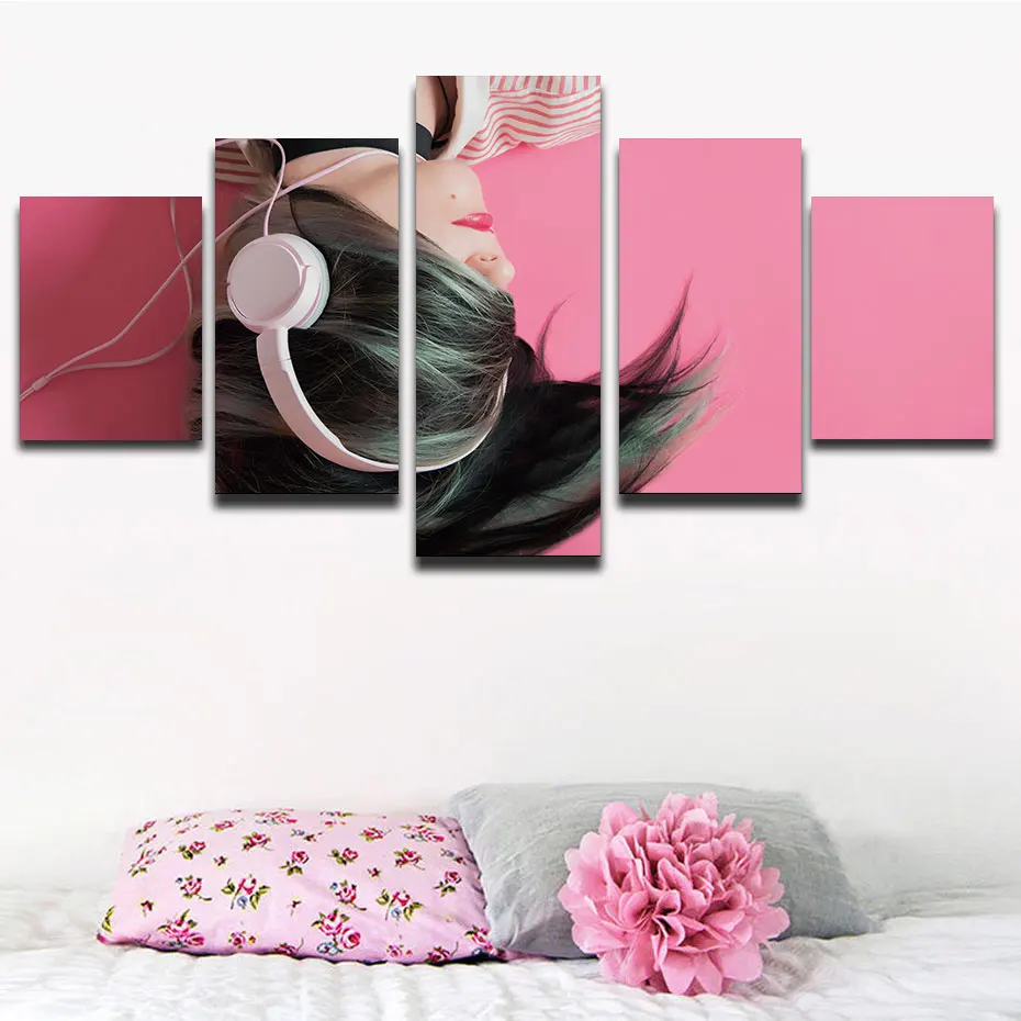 Слушайте музыку девушки HD печать 5 шт художественный постер Картина модульная розовая картина Современная художественная роспись домашний Декор Спальня