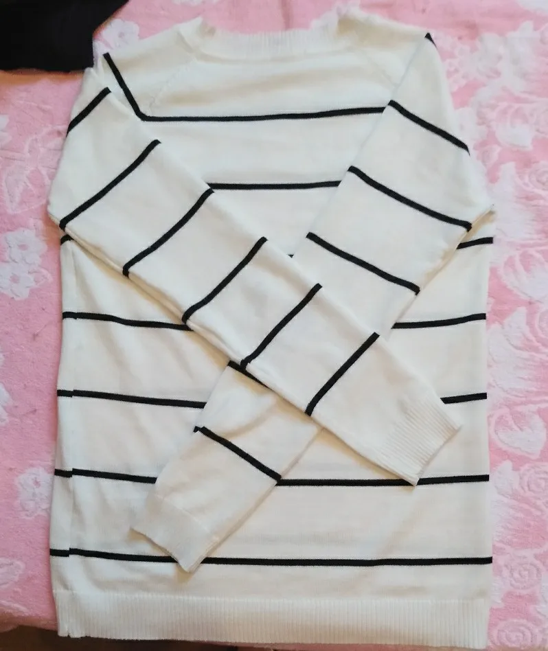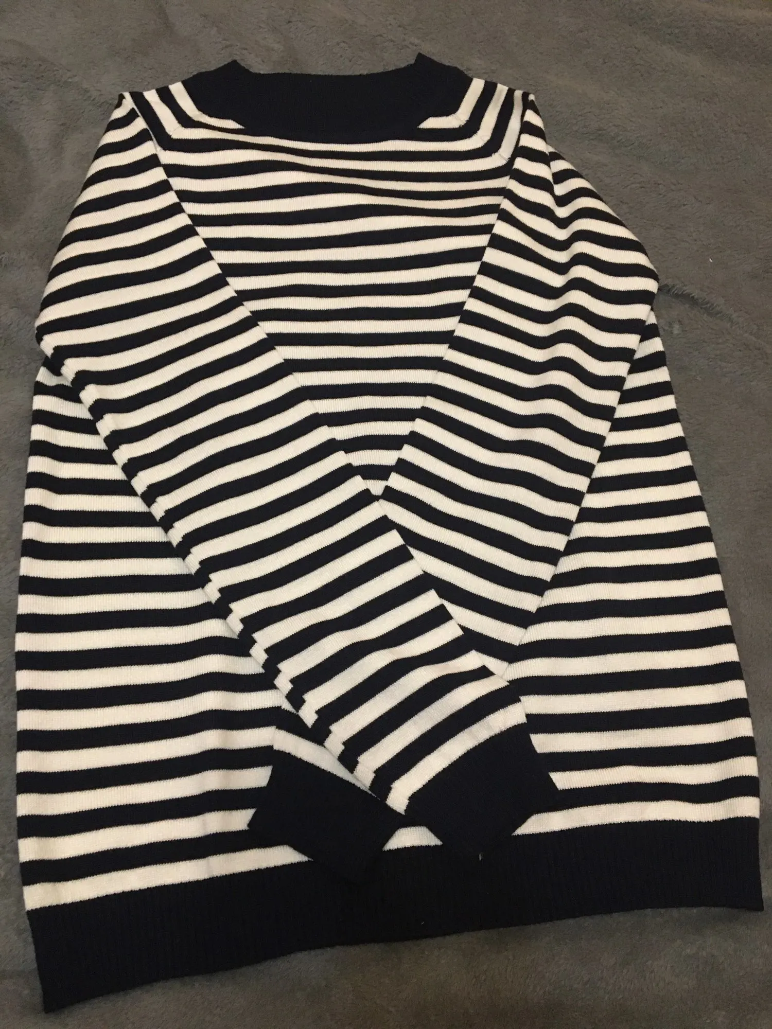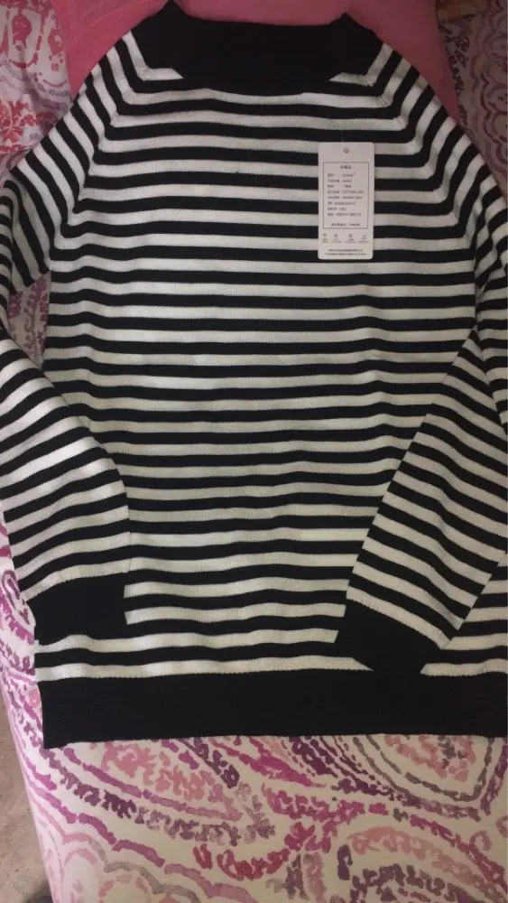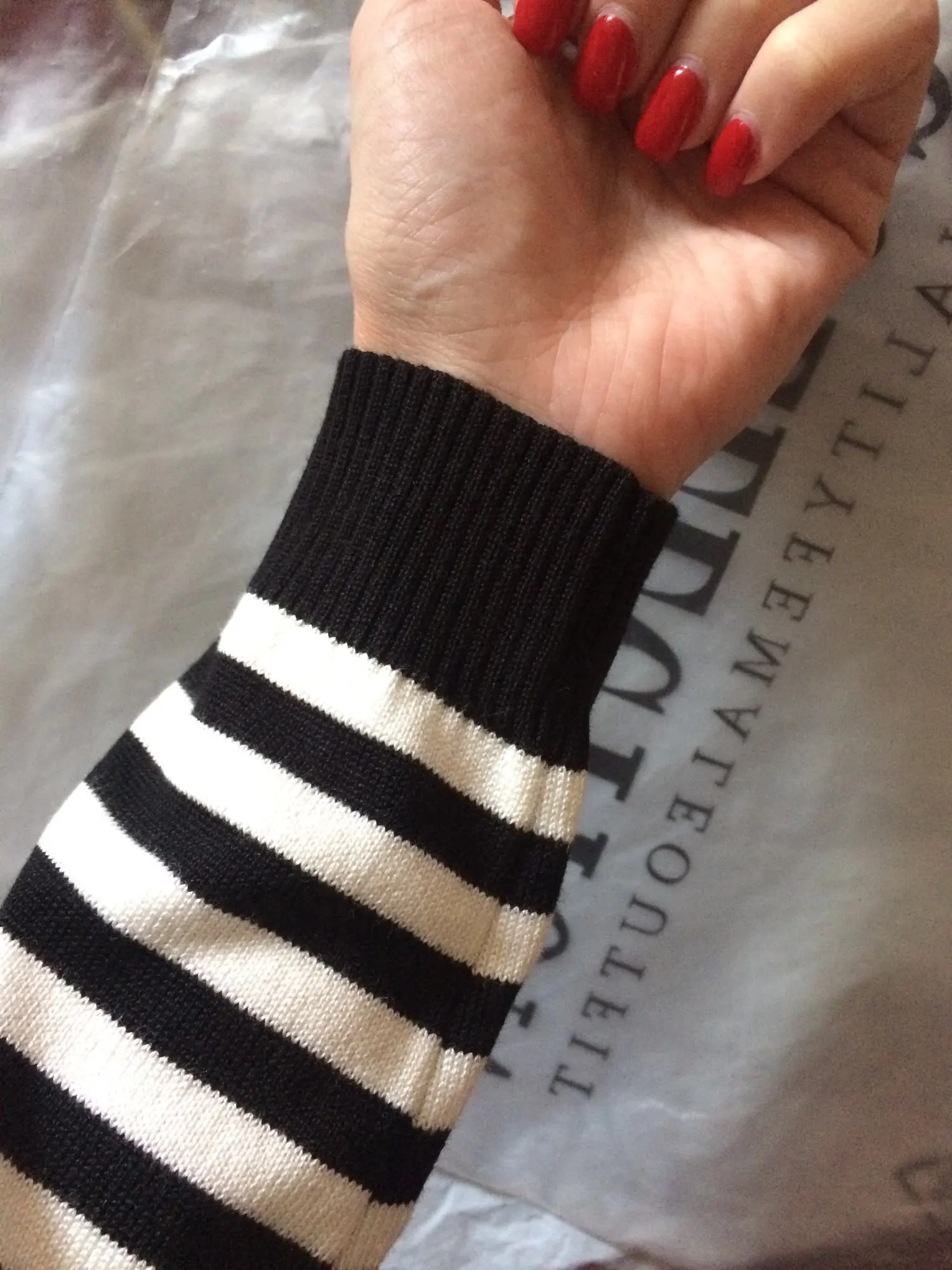 Шел джемпер больше 2 месяцев. Качество - в целом неплохое, ожидать чего-то невероятного за эти деньги - глупо. Обычный синтетический джемпер, полосы и правда сходятся как надо. Имеет сильный запах, постирала, вроде запах прошел. На 165см роста - ниже косточки, длина рукавов как надо, по телу на ог-86 и от-68 почти в облипку. Не совсем то, чего хотелось, но носить под что-то буду
