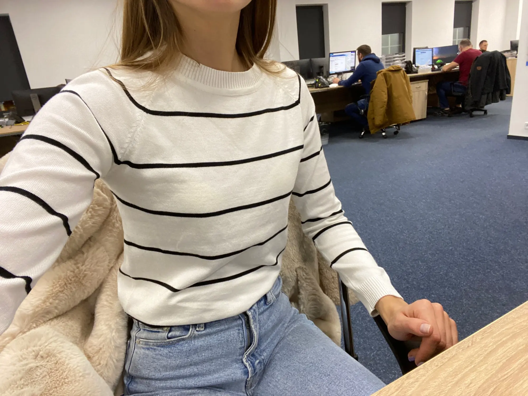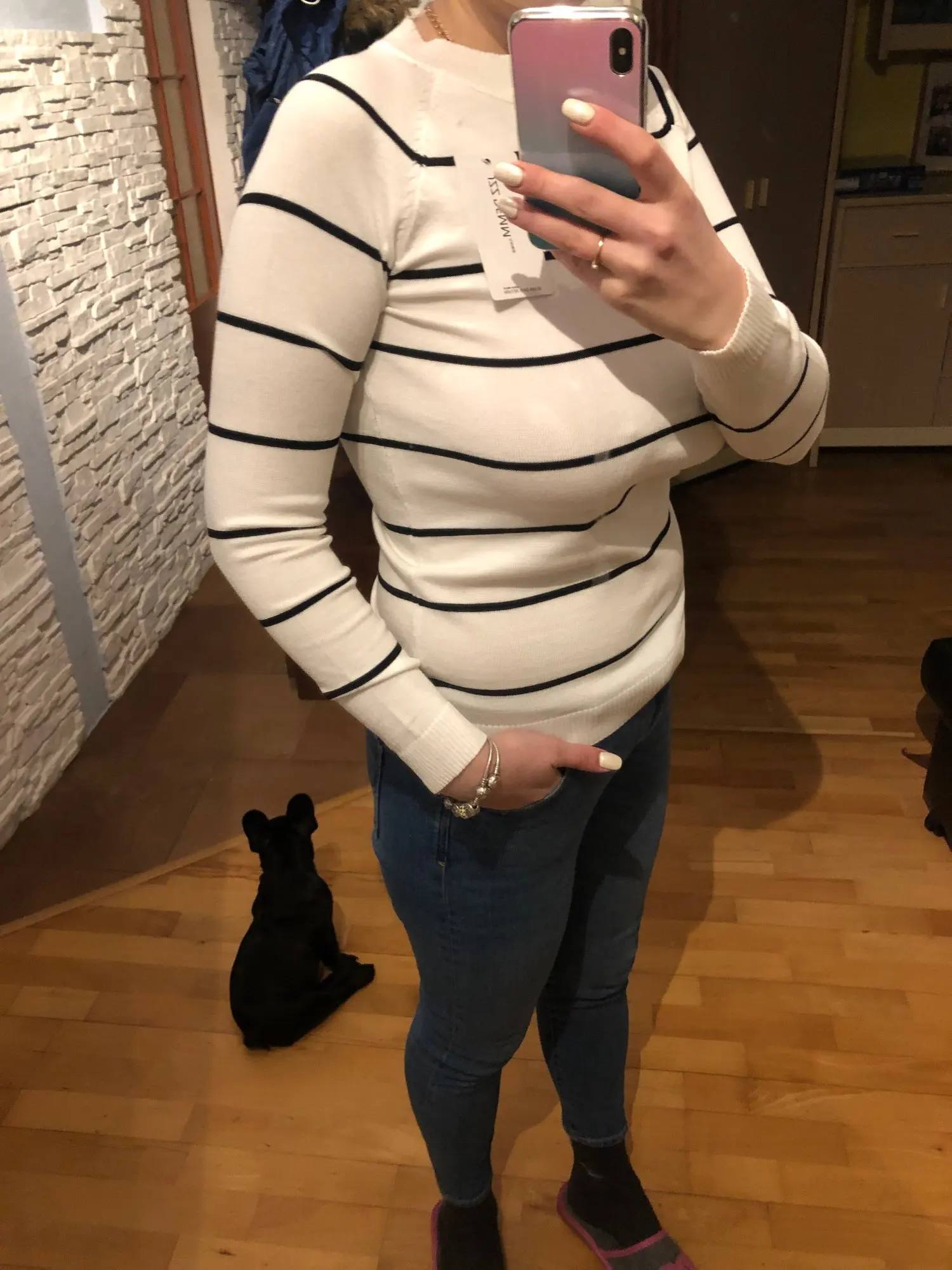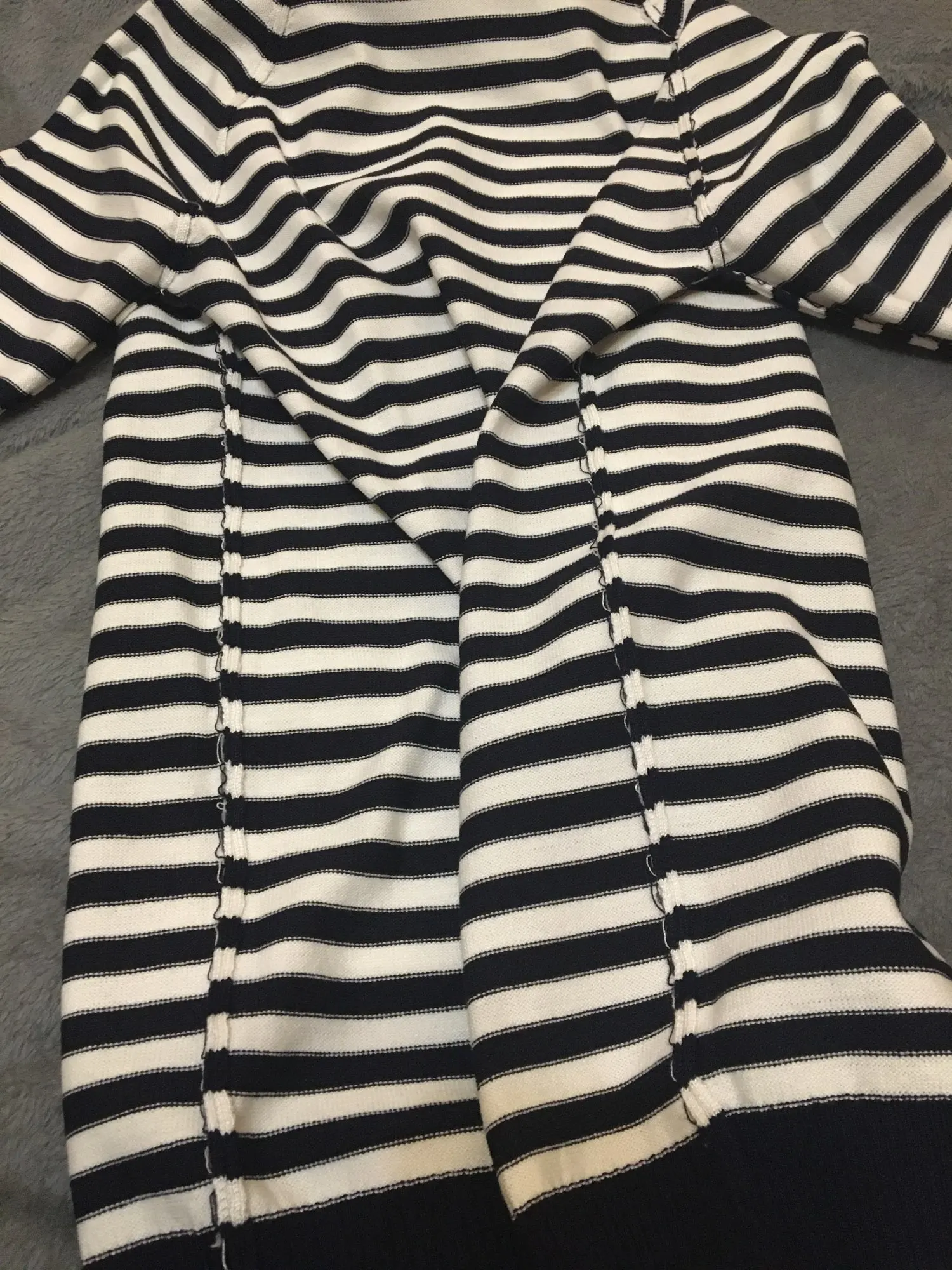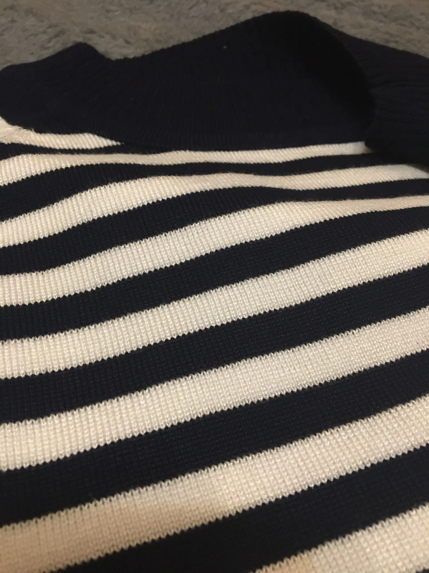 Шел джемпер больше 2 месяцев. Качество - в целом неплохое, ожидать чего-то невероятного за эти деньги - глупо. Обычный синтетический джемпер, полосы и правда сходятся как надо. Имеет сильный запах, постирала, вроде запах прошел. На 165см роста - ниже косточки, длина рукавов как надо, по телу на ог-86 и от-68 почти в облипку. Не совсем то, чего хотелось, но носить под что-то буду