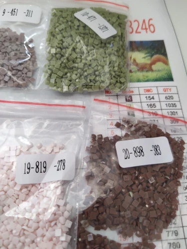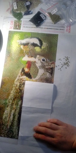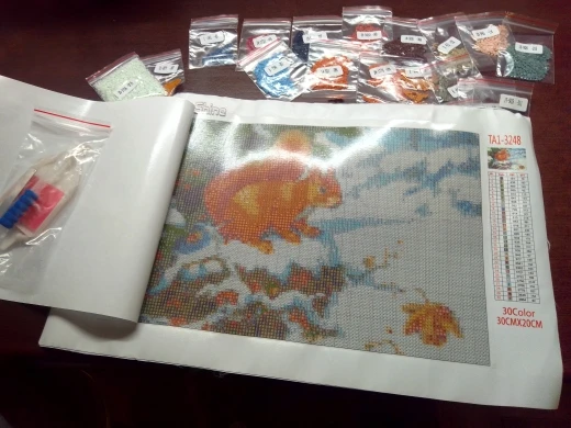 Доставка - примерно, недели три, соответствует описанию. Брала несколько картин маленького размера на пробу, очень удобно, что номерами картин обозначены и наборы мозаик, не нужно гадать какой цвет к какой картине