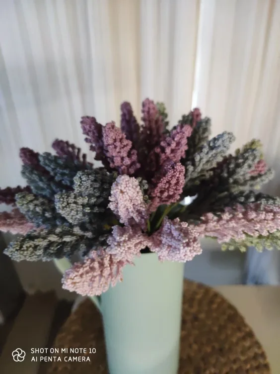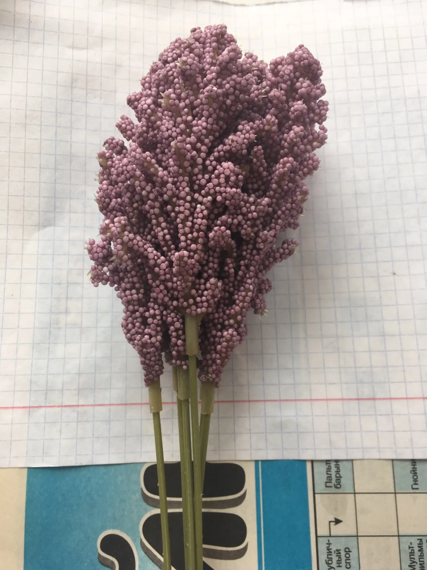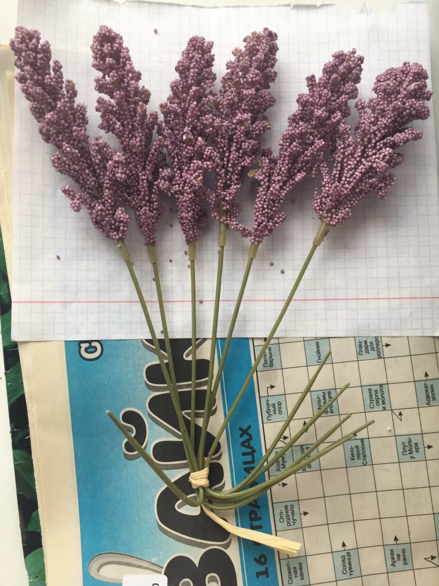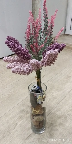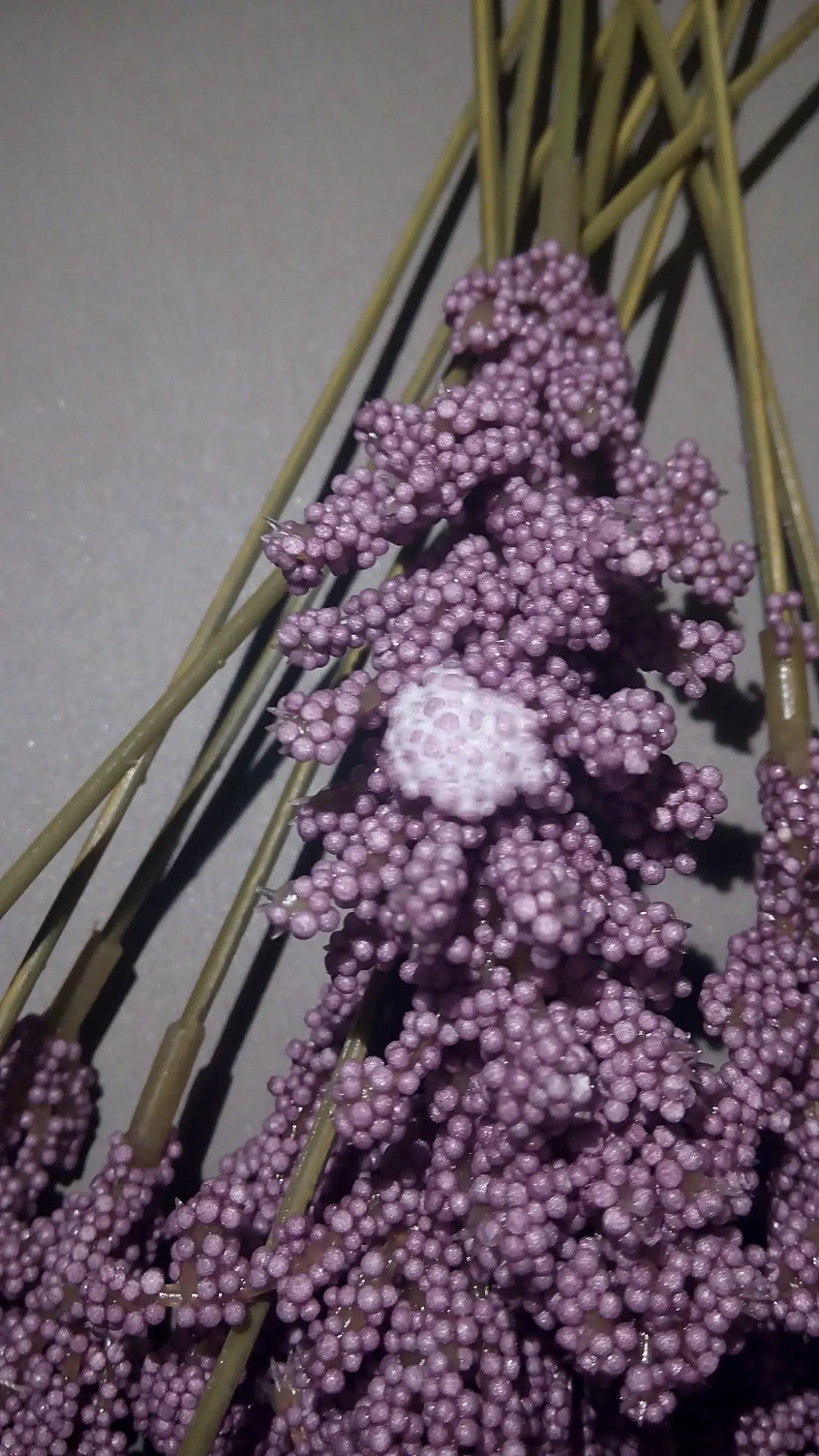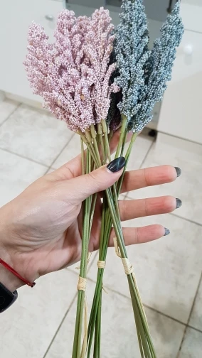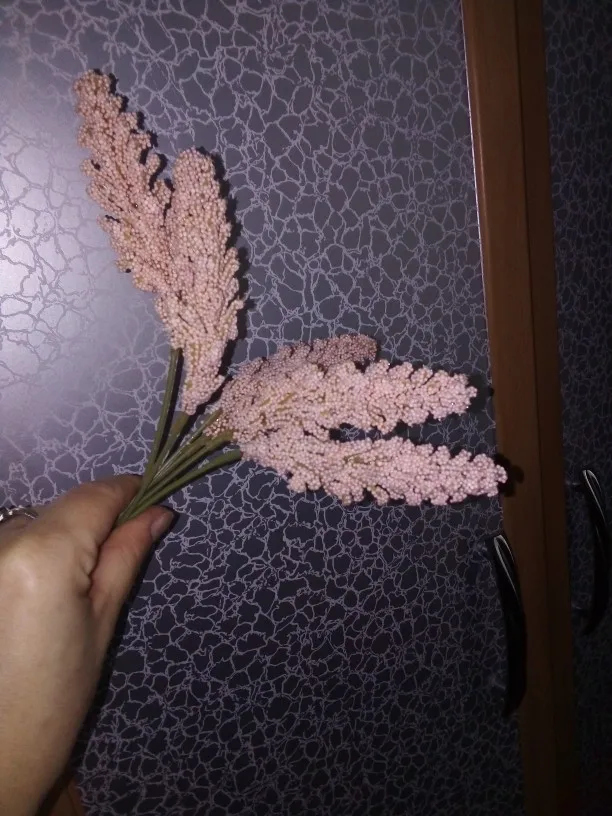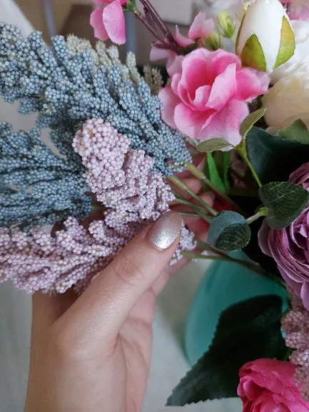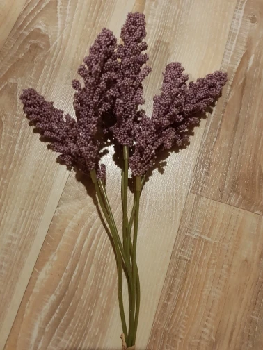 Купила за 132 руб. в 2 вариантах - '5' (зеленая) и '2' (фиолетовая). При транспортировке фиолетовые слиплись, пришлось аккуратно разъединять. Немного осыпались и те и другие, но для букета и за такую стоимость сойдёт (на картинке веточки выглядят пышнее). Пахнут чем-то техническим, довольно резко. Очень надеюсь, что выветрятся. Общая длина веточки около 33 см. В комплекте по 6 штук
