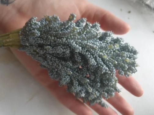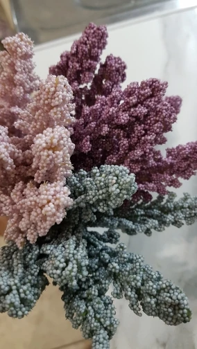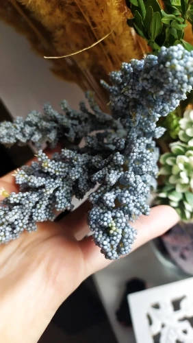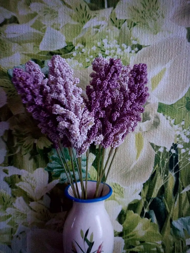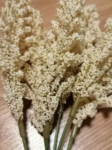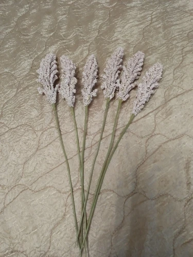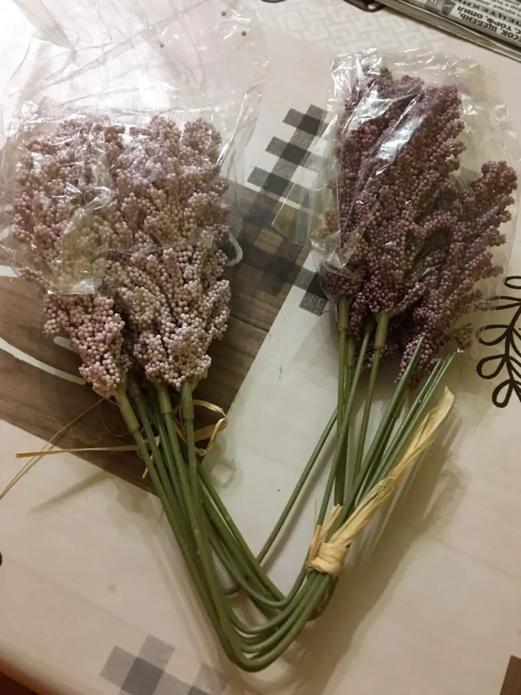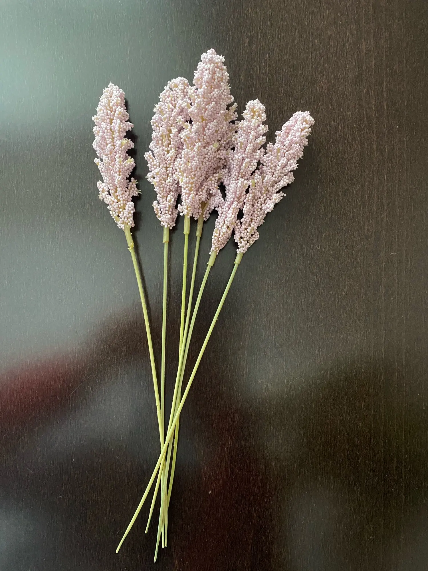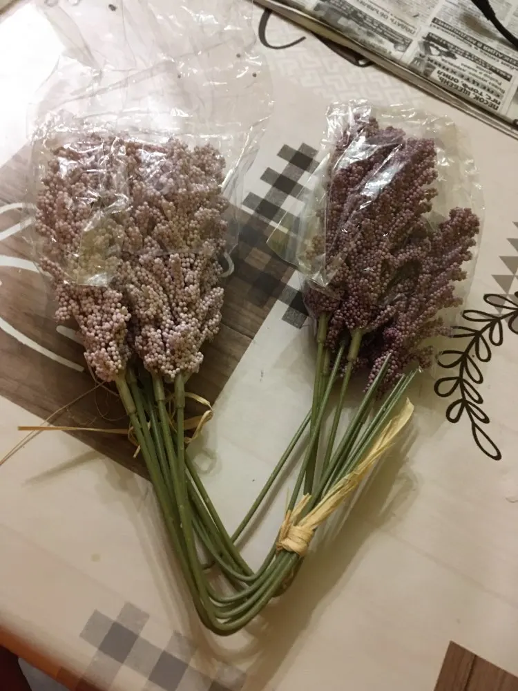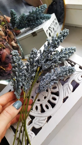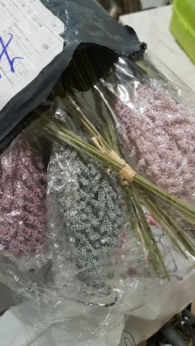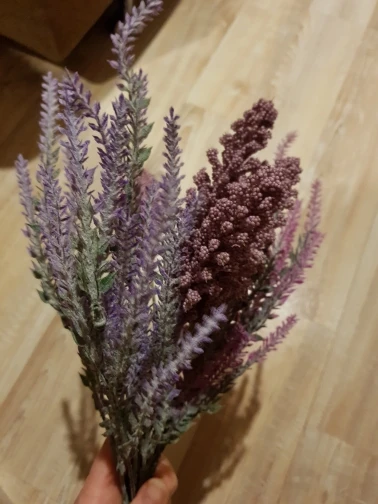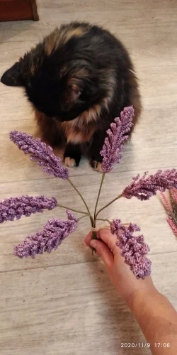 Купила за 132 руб. в 2 вариантах - '5' (зеленая) и '2' (фиолетовая). При транспортировке фиолетовые слиплись, пришлось аккуратно разъединять. Немного осыпались и те и другие, но для букета и за такую стоимость сойдёт (на картинке веточки выглядят пышнее). Пахнут чем-то техническим, довольно резко. Очень надеюсь, что выветрятся. Общая длина веточки около 33 см. В комплекте по 6 штук
