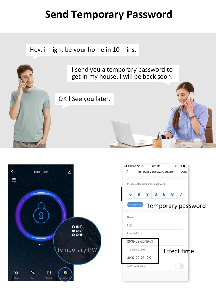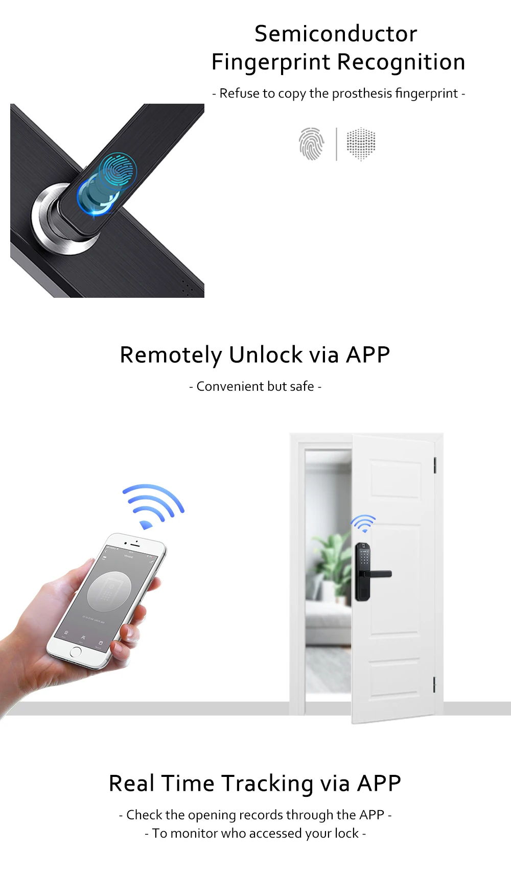 Дистанционно Управляйте замком● Нет необходимости в шлюзе для подключения wifi● Нажмите «9 + #» на клавиатуреУдаленная разблокировка● Отправить временный пароль● Получите записи разблокировки