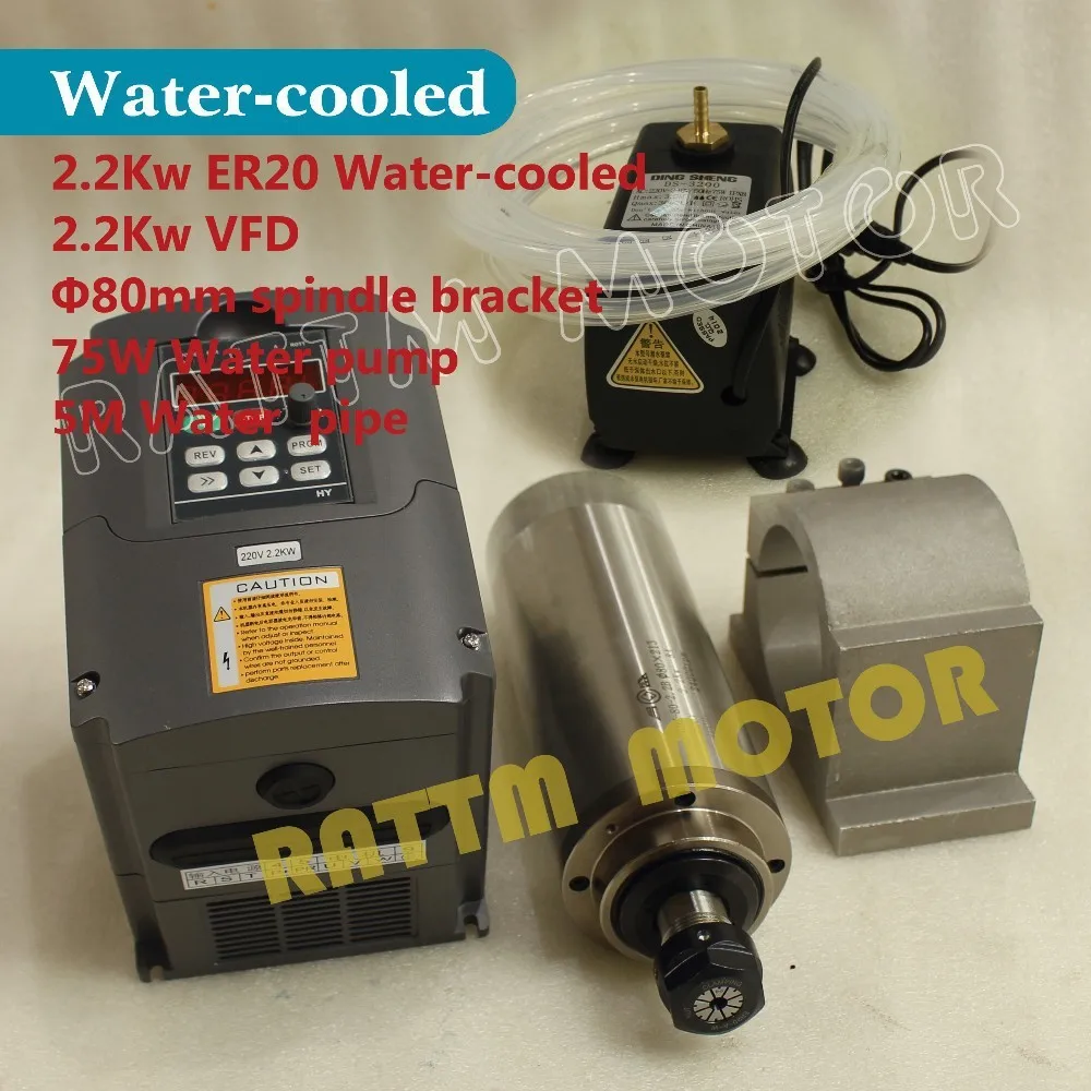Двигатель шпинделя с водяным охлаждением, 220 кВт, ER20, 4 подшипника, VFDинвертор, 80 мм зажимкронштейн шпинделя, 75 Вт водяной насос в