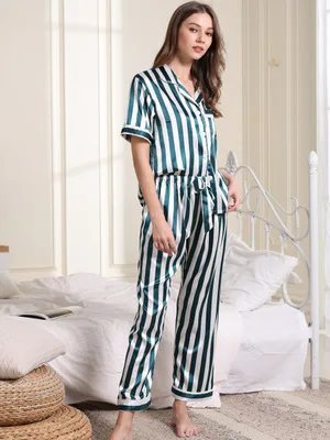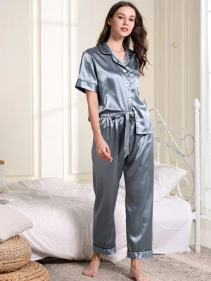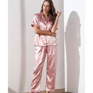 Daeyard Женская пижама, Летняя шелковая рубашка на пуговицах с коротким рукавом и брюки, комплект из 2 предметов, Дамская пижама, одежда для сна, домашняя одежда