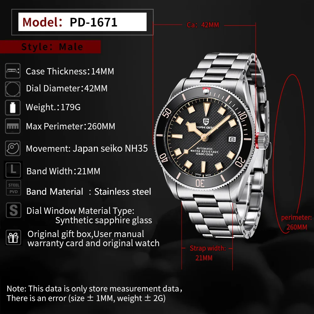 Модель: PD-1671Механизм: Япония Seiko NH35A [автоматический механический механизм]Чехол: материал-нержавеющая сталь 316L, процесс рисования42 мм в диаметреДлина 48 ммТолщина 13 ммШирина ремешка 20 ммСтекло: сапфировое стеклоБезель: анодированный алюминиевый дефлектор, световой знак 12 часовЦвет циферблата: матовый черный, матовый синий, матовый красный, матовый черный и синийСтрелки: ретро Снежинка руки, светящееся покрытиеСветящийся: Ретро светящийся эффект BGW-9 синий светильник, стрелки и маркерыКорона: заводная головка с 3D логотипом бренда с глубоким прессованным узоромЧехол на заднюю панель: прозрачная нижняя крышка с винтомРемешок: твердый браслет из нержавеющей стали 316L с заклепкамиЗастежка: Складная безопасная пряжка с логотипом PAGANIВодонепроницаемость: 10 бар = 100 метровВес: около 145 г
