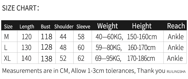 Обхват груди 118 см, ширина плеч 44 см, рукав 58 см, длина халата 120 см.