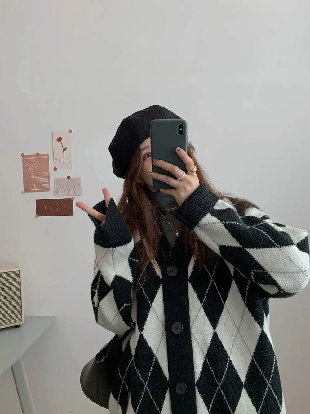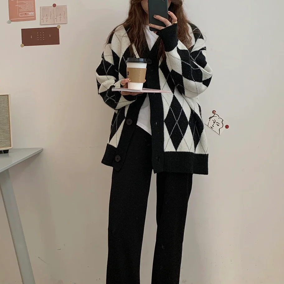 Корейский Кардиган оверсайз, топы, Женский вязаный свитер, кардиган с рисунком ромбиками, свободный однобортный, для студентов, красивая трикотажная одежда с V-образным вырезом, 17068