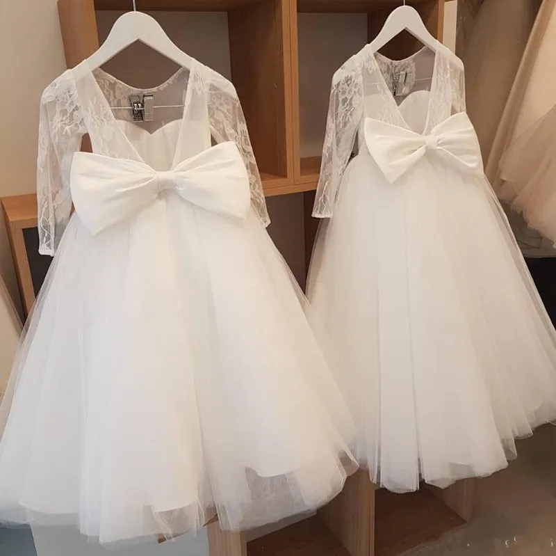 Платье для девочки с цветочным принтом на заказ, свадебное платье с длинным рукавом, V-образным вырезом, бантом, из тюля, для первого причастия, новые дешевые платья для крещения