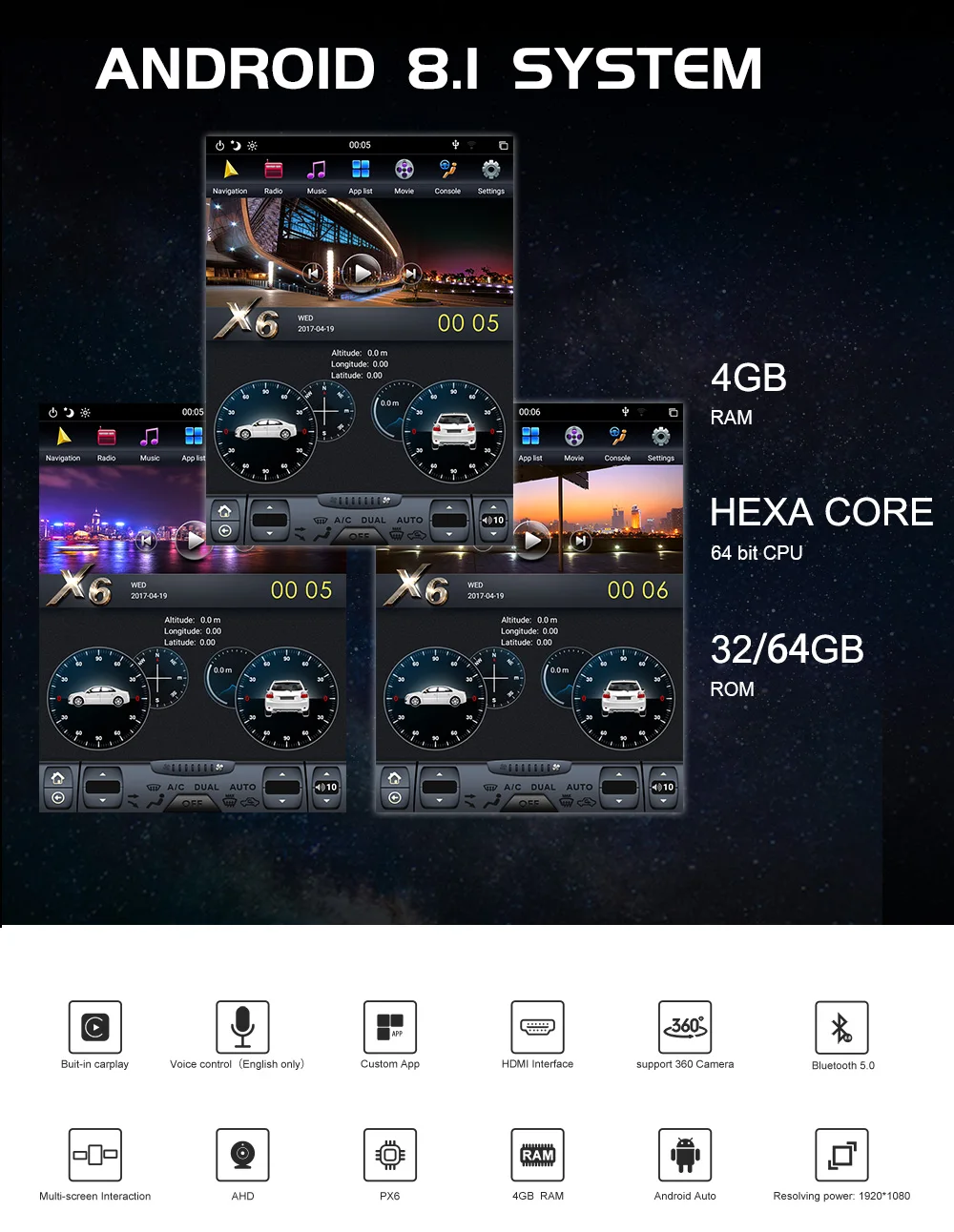 1.Android 7,1: Процессор: четырехъядерный 64 бит PX3 Оперативная память: 2 Гб DDR3 ROM: 32 ГБ 2.Android 8,1 с Carplay + IPS: Процессор: шестиядерный 64 бит PX6 Оперативная память: 4 Гб DDR3 Встроенная Память: 32 GB/64GB 3.Android 9,0 с Carplay + DSP + IPS: Процессор: шестиядерный 64 бит PX6 Оперативная память: 4 Гб DDR3 Встроенная Память: 32 GB/64GB Разрешение экрана: 1920*1020 или выше, емкостный 5 точек Мультитач, с функцией двойной зоны Bluetooth 5,0 ручная синхронизация телефонных звонков список контактов Встроенная функция Wi-Fi (Используйте точку доступа со смартфона для подключения к Интернету) Встроенное приложение Google Play Store, загрузите приложение, которое вы хотите. Оперативная память: DDR3 4 Гб, поддержка внешней флэш-памяти 32 Гб Встроенная автономная карта GPS, поддержка онлайн-карты, поддержка Google Map. Аудиовыход 4*50 Вт, эквалайзер: 9 эквалайзеров для звука Радио чип NXP6686, AM / FM с RDS