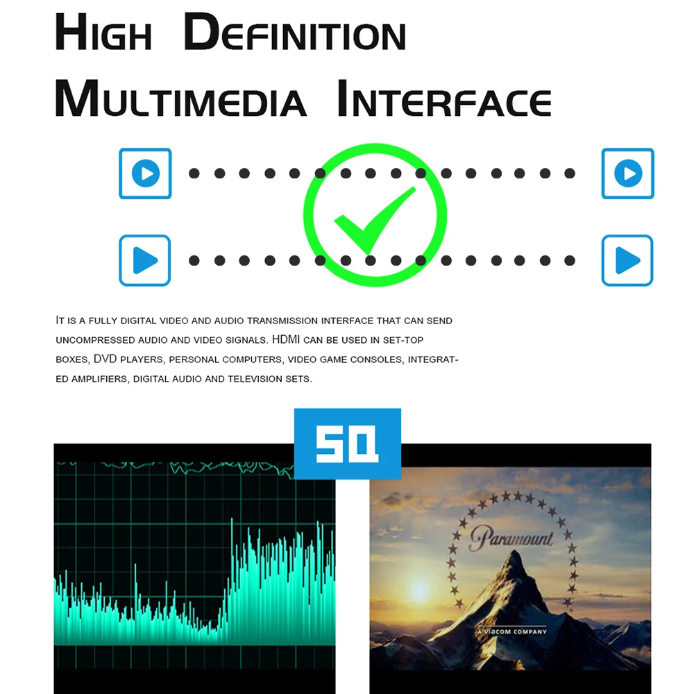 Это полностью цифровой интерфейс передачи видео и аудио, который может отправлять несжатые аудио и видео сигналы. HDMI может использоваться в телевизионных коробках, dvd-плеерах, персональных компьютерах, игровых консолях, интегральных усилителях, цифровых аудио и телевизорах.