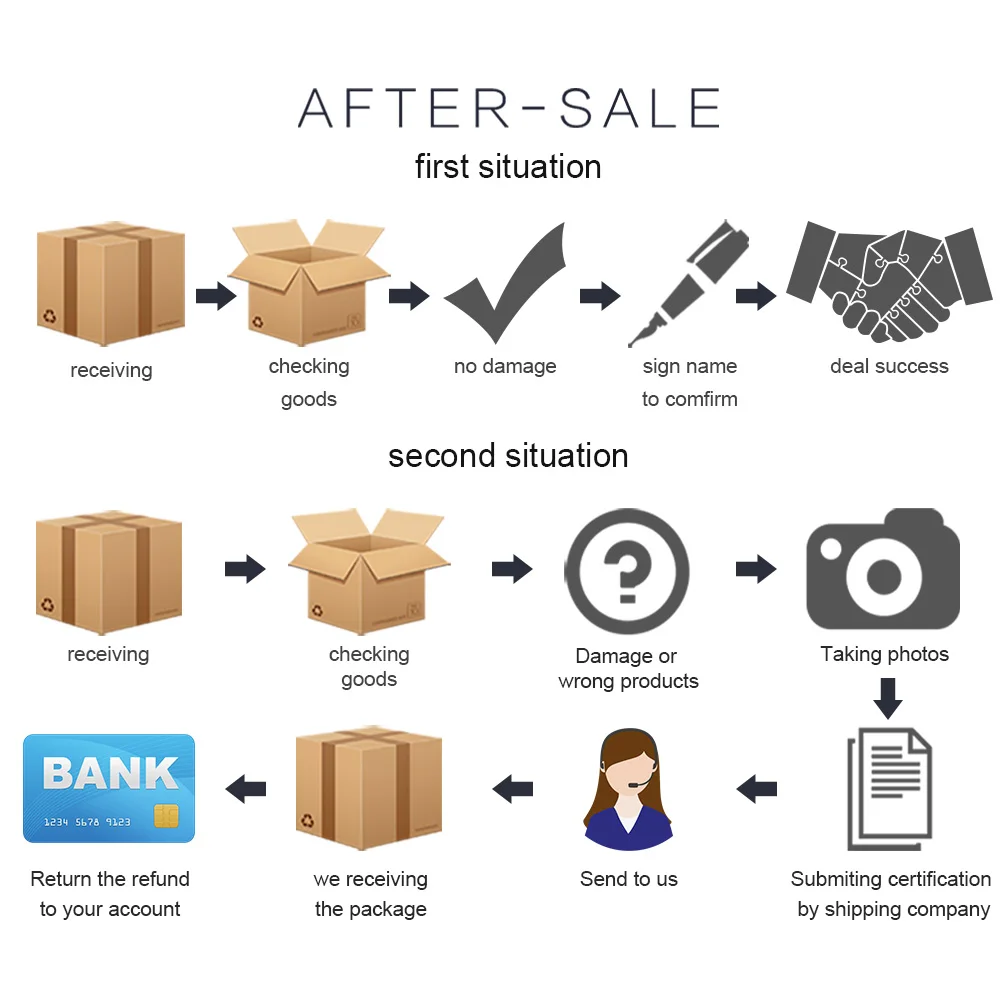 Первая ситуация: получение-проверка товаров-отсутствие повреждений-имя знака для подтверждения-Успех сделки. Вторая ситуация: получение-проверка товаров-повреждение или неправильная продукция-фотосъемка-отправка сертификатов транспортной компанией-отправка нам-мы получаем посылка-возврат средств на ваш счет.
