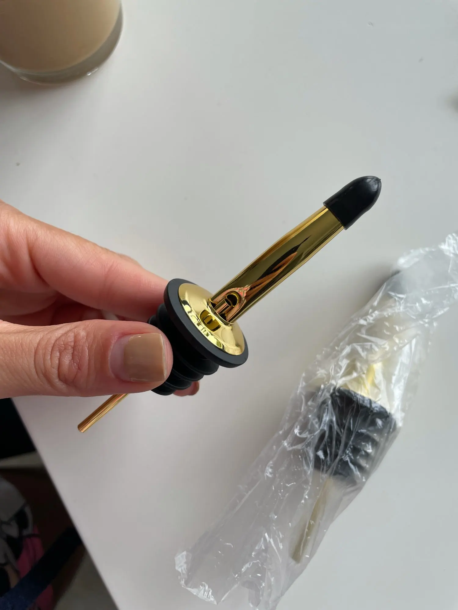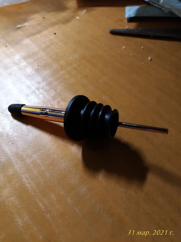 думала подойдёт на бутылку с оливковым маслом,но не подошло ( предназначена на узкое горлышко, найдём применение