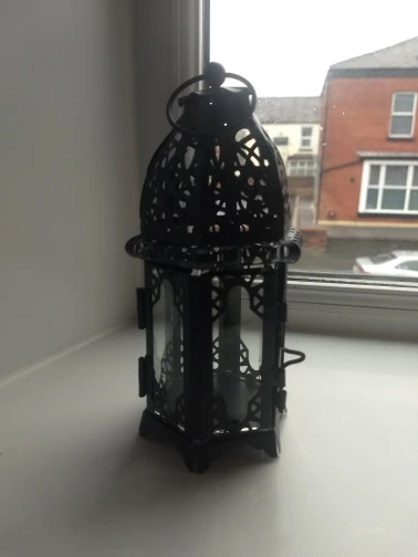 Одна из сторон открывается с помощью металлической защелки, чтобы свеча (не входит в комплект) была помещена внутрь.