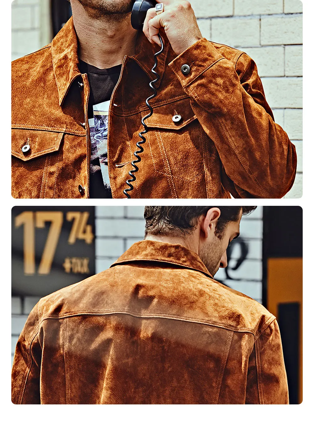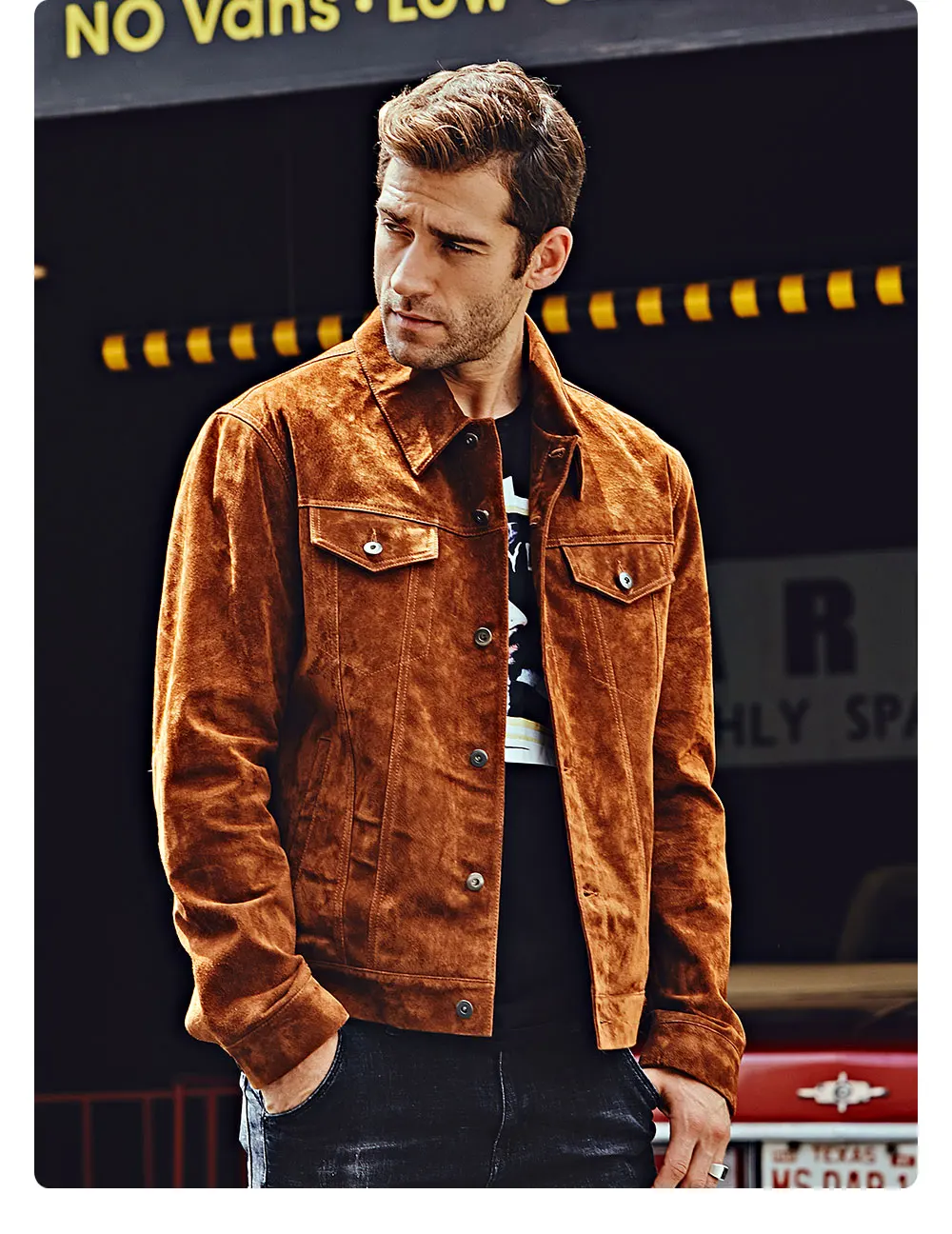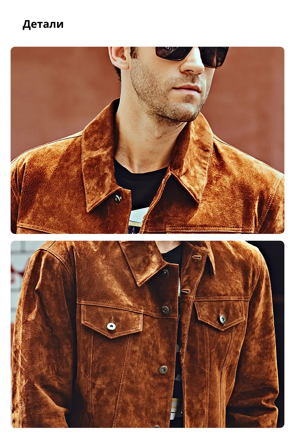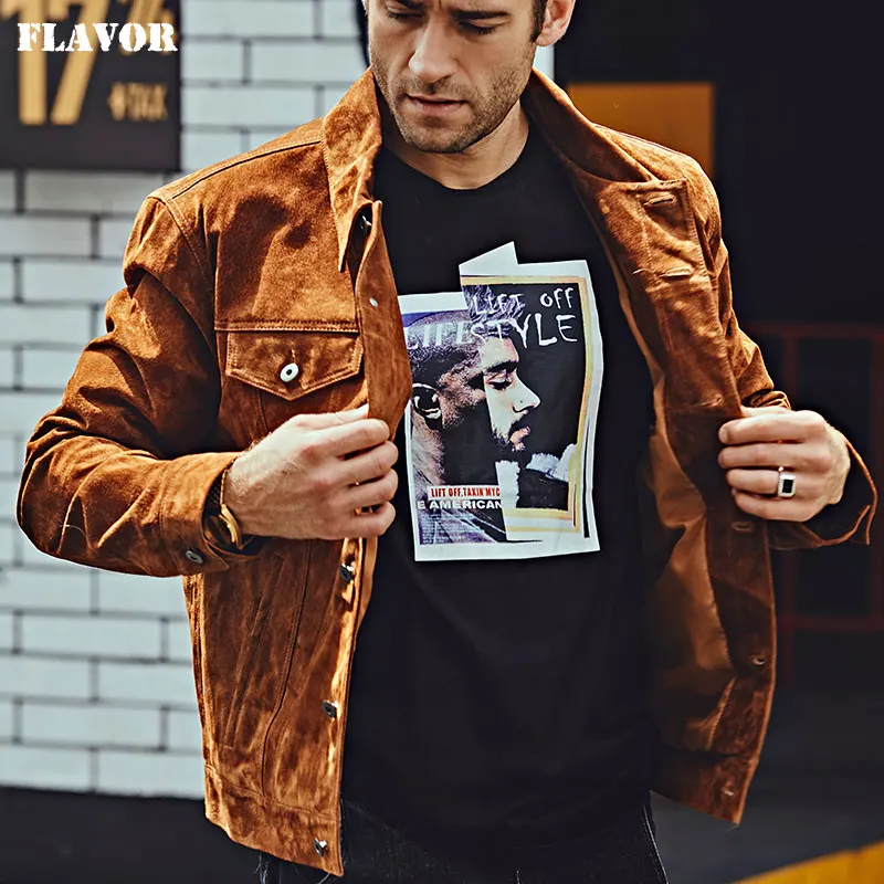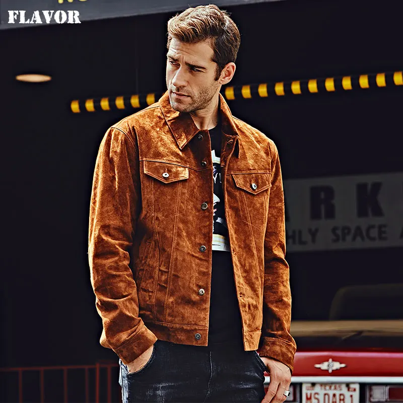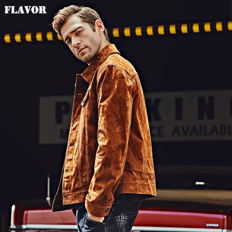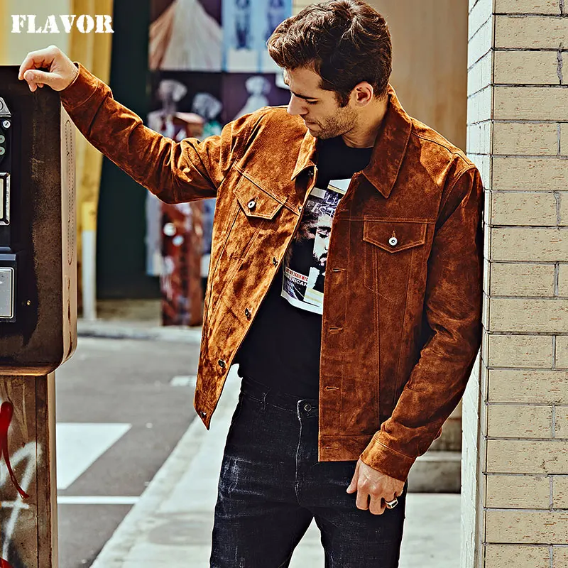Мужская джинсовая куртка FLAVOR, коричневая куртка из натуральной свиной шкуры, осеннее пальто из натуральной кожи