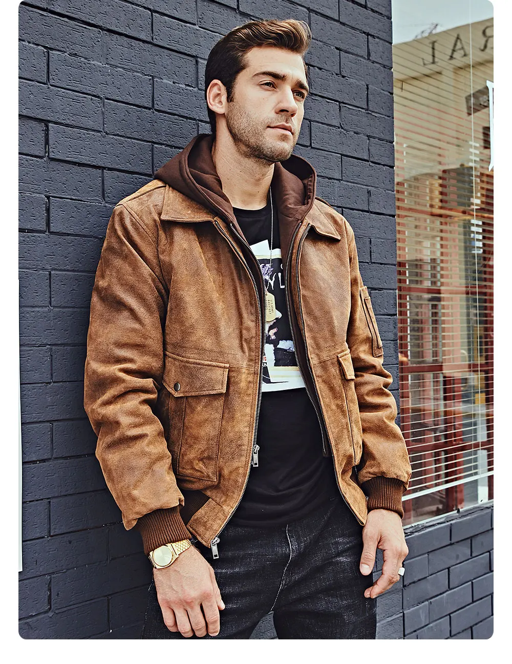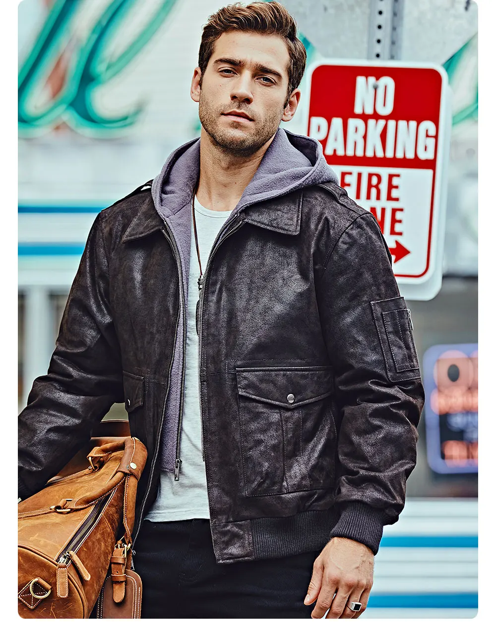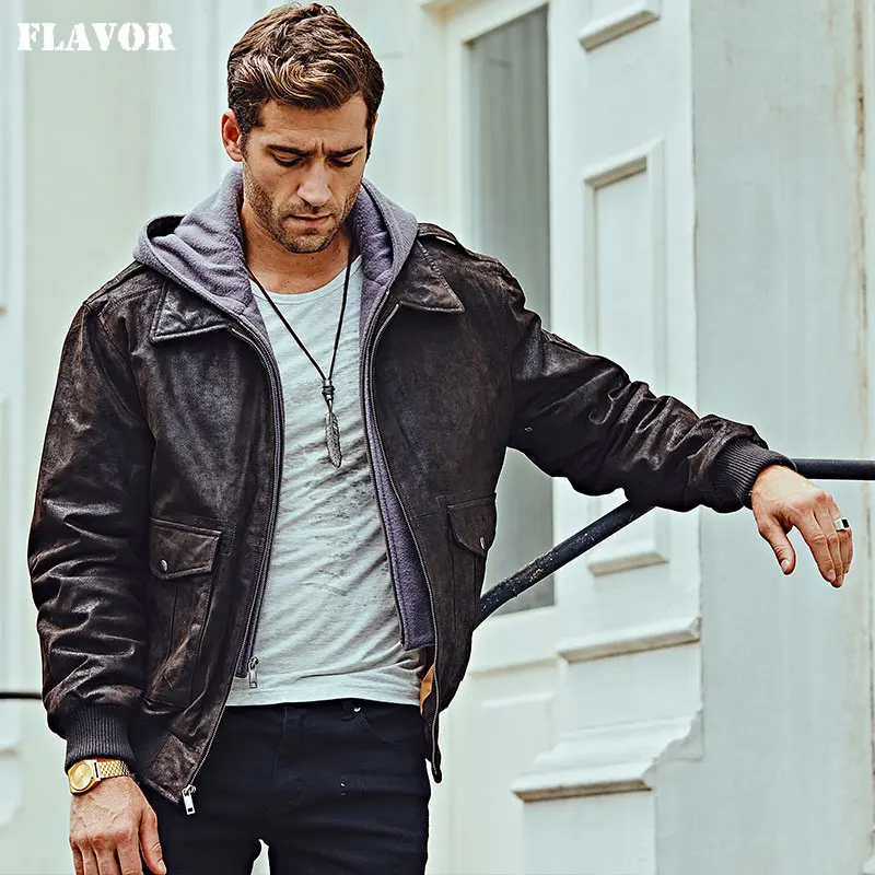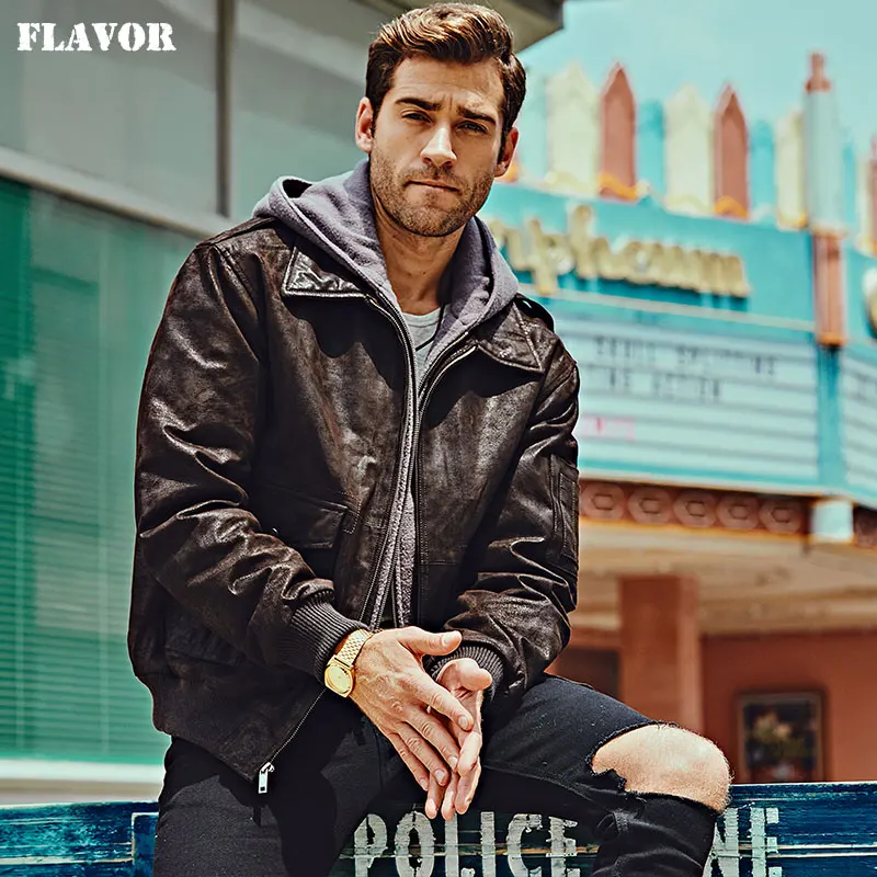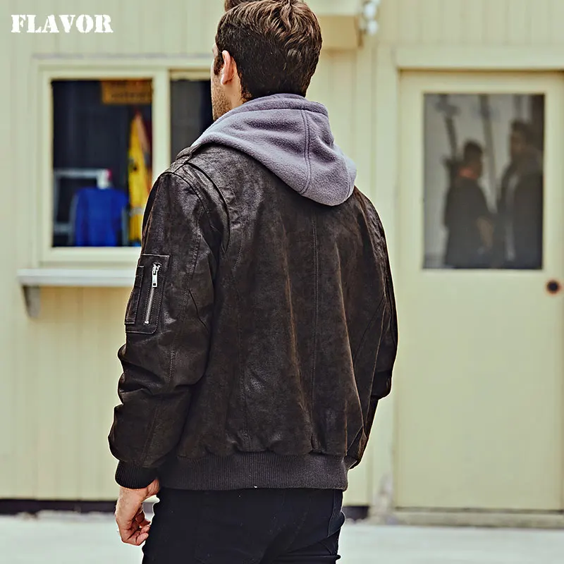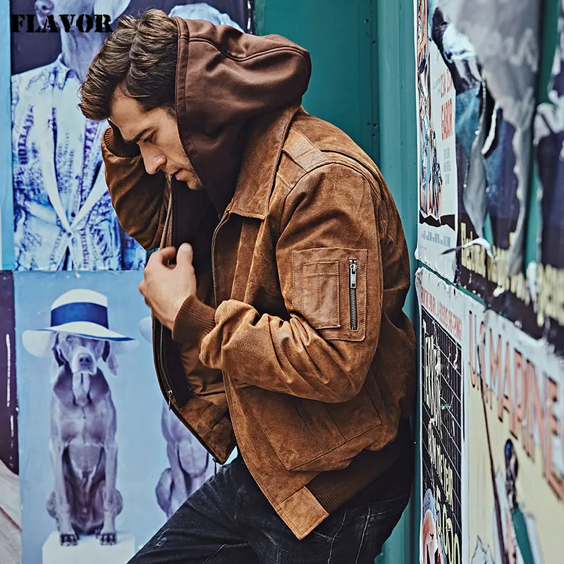 Мужская кожаная куртка-бомбер FLAVOR, куртка-Авиатор из натуральной кожи со съемным капюшоном, теплая куртка на зиму