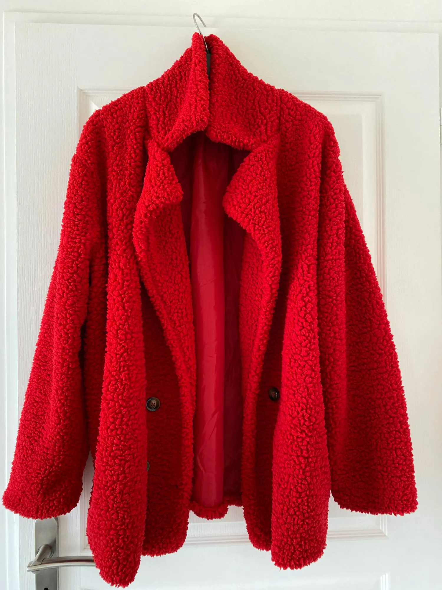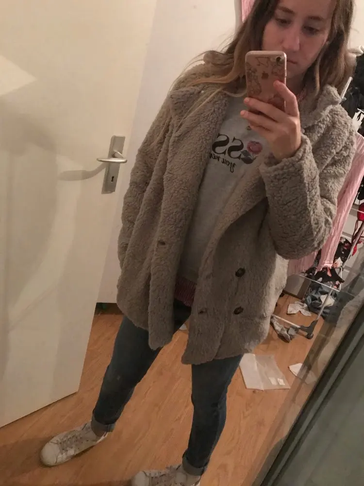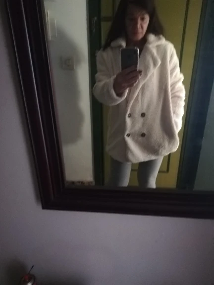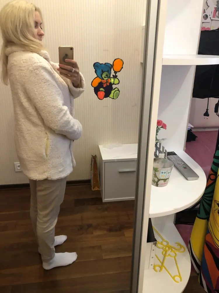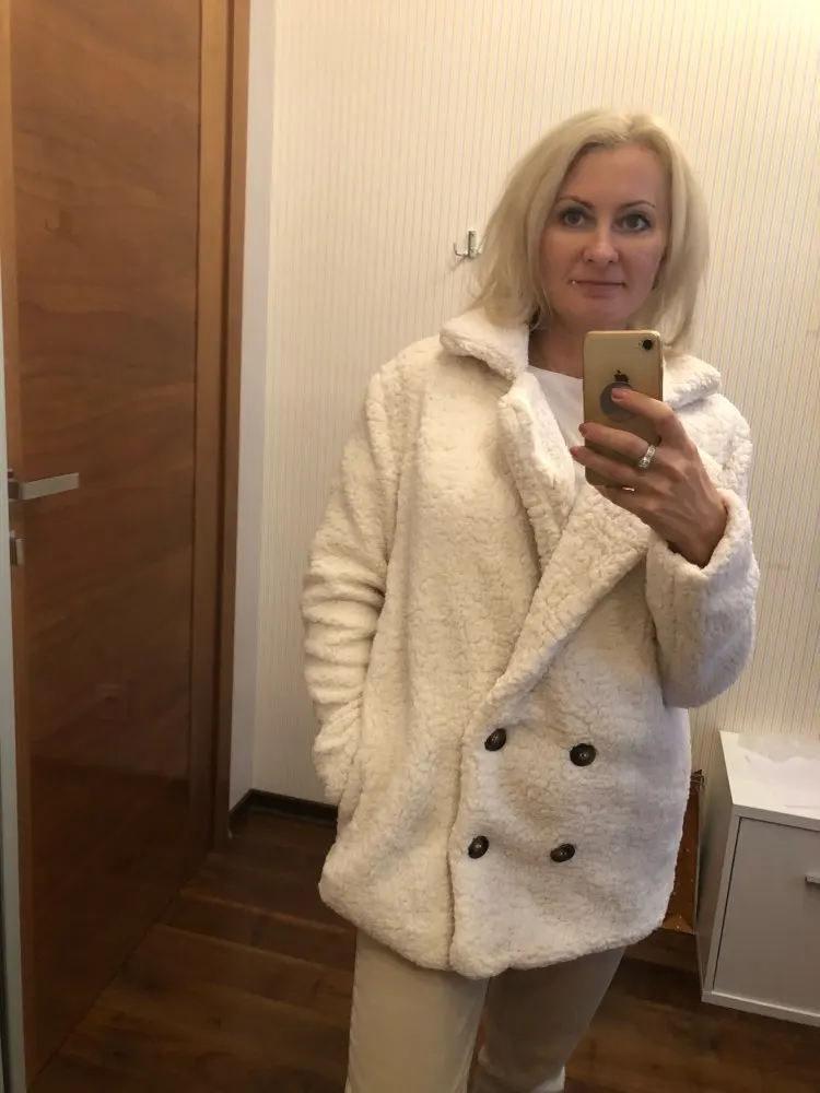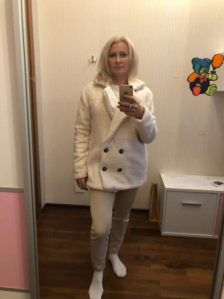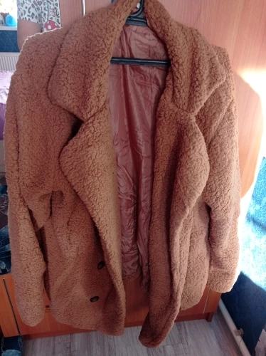 Фасон этого изделия нехороший( несуразный): пуговицы внизу, под животом. 2 штуки слева, 2 справа, по фактуре не подходят. Чтобы запахнуть это пальто-куртку, надо будет прикрепить брошку, т.к. пуговицы его не застёгивают. Взяла на размер больше, как советовали в коментах, смотрится как будто больше на 2 размера. Плюш приятный, с подкладкой. К покупке не советую. Шло 2 месяца.